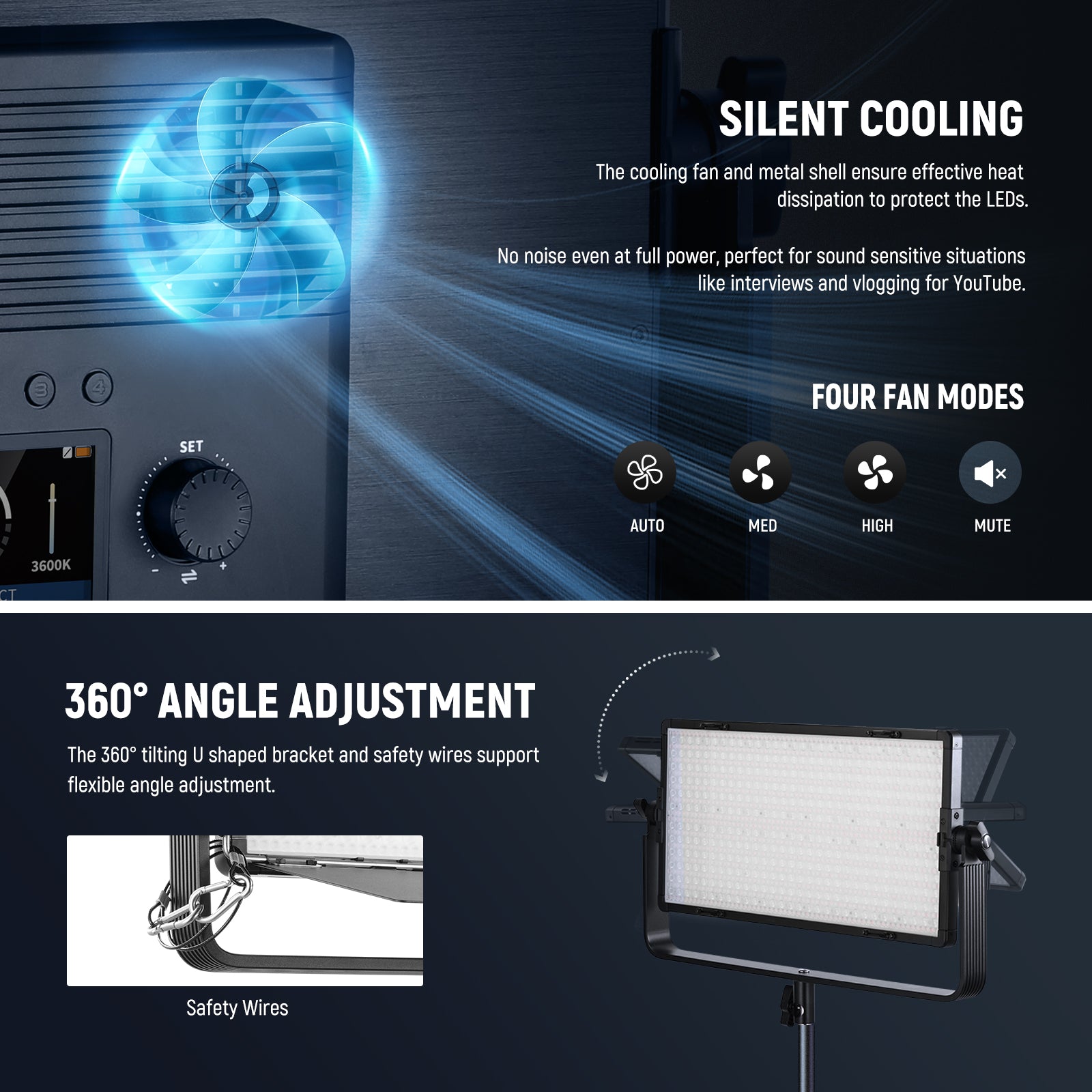 - Ventola di raffreddamento silenziosa e modalità Smart FM : questa luce è dotata di un sistema di raffreddamento super silenzioso ottimizzato per la registrazione sul set, che garantisce il 100% di potenza in uscita riducendo al minimo il rumore della ventola. Offre le modalità Smart, Medium, High e Silent per creare un ambiente di ripresa quasi silenzioso. La robusta custodia in metallo accelera la dissipazione del calore, prolungando la durata della luce. La modalità FM intelligente integrata regola la frequenza della luce per evitare sfarfallii durante le riprese ad alta velocità