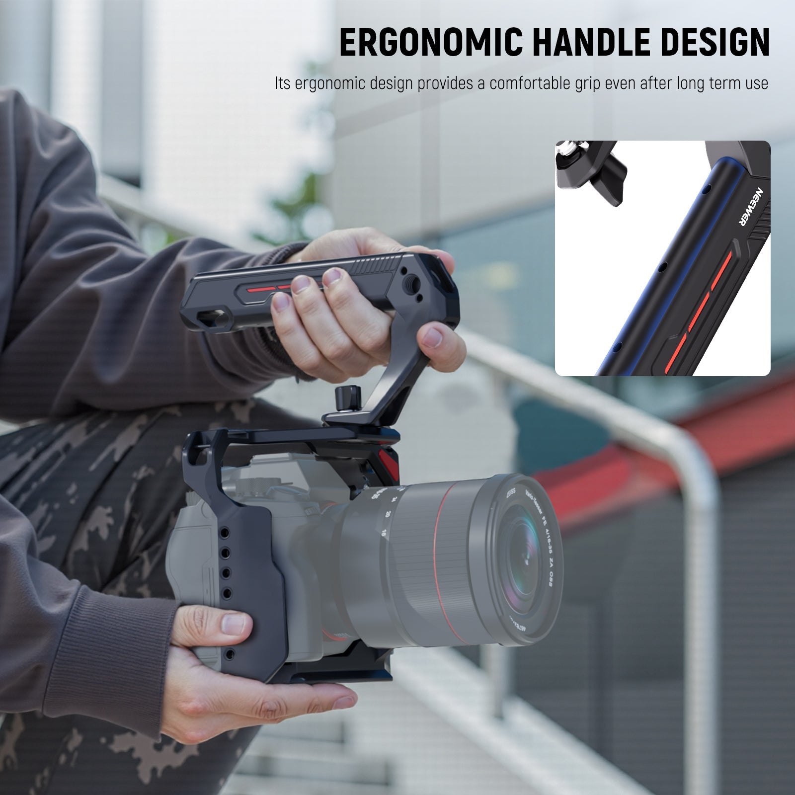 - Leggera e ad alta resistenza : realizzata in lega di alluminio e ABS, la maniglia superiore della fotocamera combina un design leggero con una resistenza e una durata eccezionali, garantendo prestazioni affidabili in ambienti di ripresa impegnativi, soprattutto a basse temperature, riducendo al contempo il carico complessivo dell'attrezzatura. Inoltre, il design ergonomico offre una presa comoda anche durante l'uso prolungato.