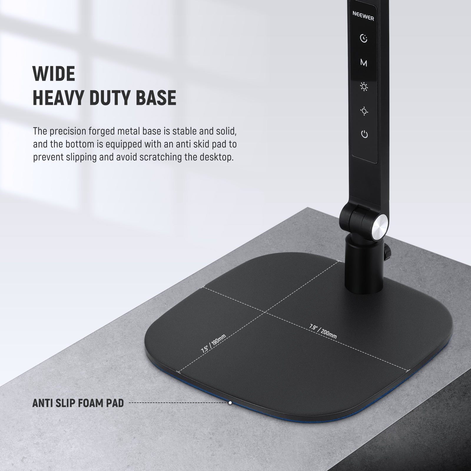 - Ampia base robusta - A differenza di altre lampade da tavolo con montaggio a morsetto che richiedono un'installazione laboriosa e sono limitate al bordo della scrivania, la piccola lampada da tavolo a pannello NEEWER presenta un'ampia base in lega di alluminio pesante (190x200x7 mm) che fornisce un supporto stabile su qualsiasi superficie piana. Ciò consente un movimento facile e flessibile senza la necessità di un montaggio e smontaggio faticoso. Inoltre, la base è dotata di una morbida imbottitura in schiuma per garantire stabilità antiscivolo.