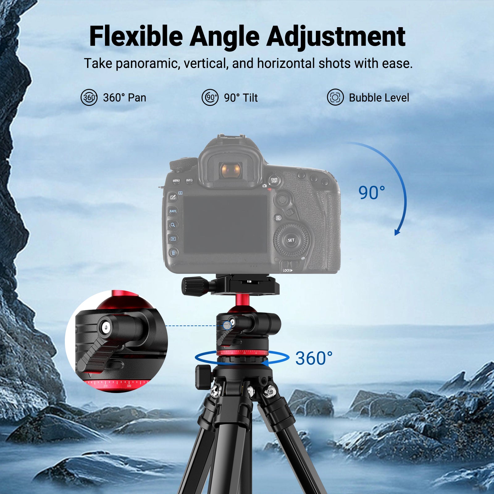 - Detachable Low Profile Panoramic Ball Head- Enhanced stability with a lower center of gravity, φ40mm scaled pan base, and U shaped groove for smooth panoramas and 90° vertical shots. It is detachable for mounting on other camera tripod stands, monopods, and sliders via a 3/8" thread. A 1/4" thread on the QR clamp enables more flexible accessory mounting