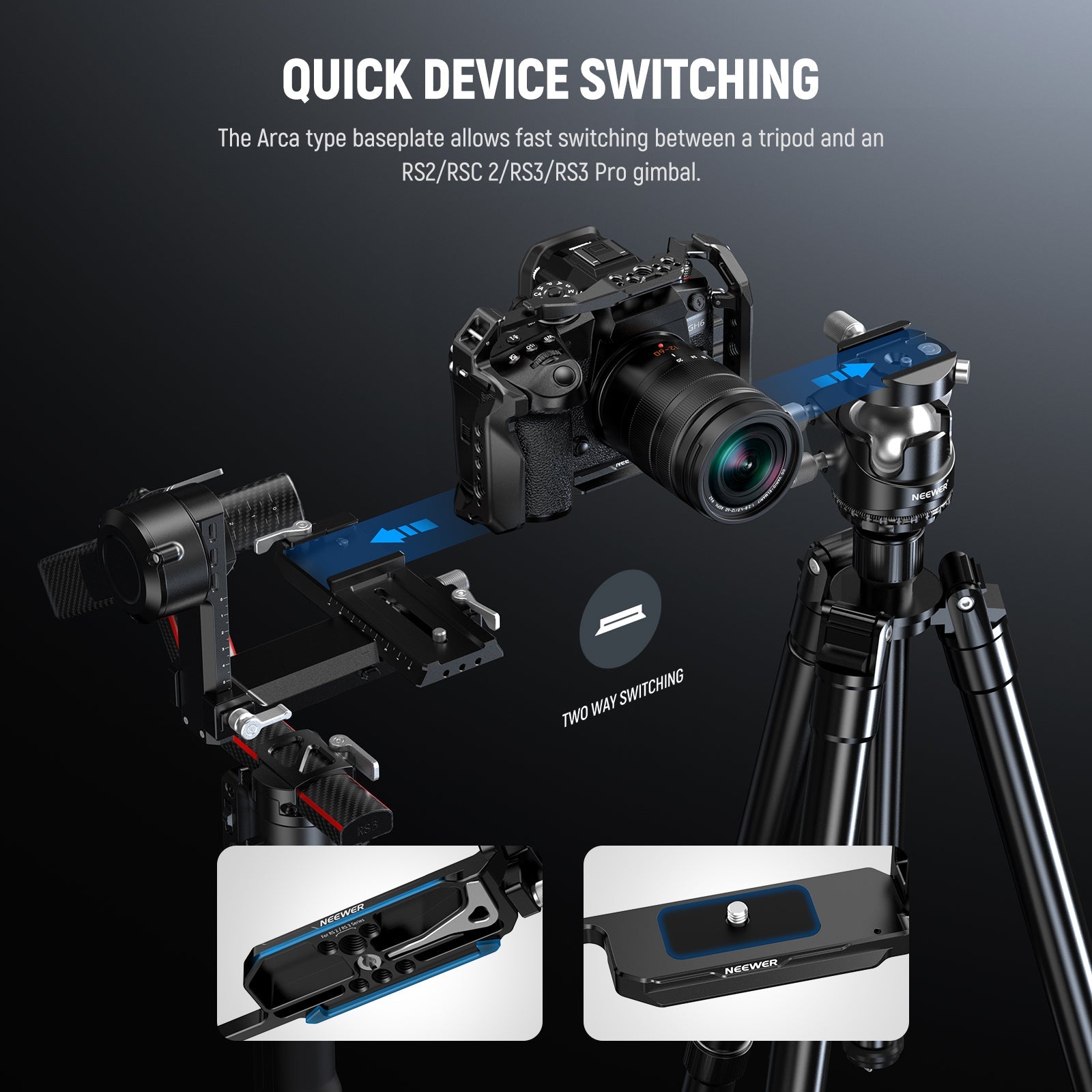 - Trasferimenti di attrezzature di tipo Arca : la piastra di base a sgancio rapido di tipo Arca consente di trasferire rapidamente la fotocamera da uno stabilizzatore portatile a un treppiede, poiché è perfettamente compatibile con i gimbal DJI RS 2 RSC 2 RS 3 RS 3 Pro e la maggior parte delle teste del treppiede. È possibile montare questo impianto video GH6 su un treppiede sia in orientamento orizzontale che verticale