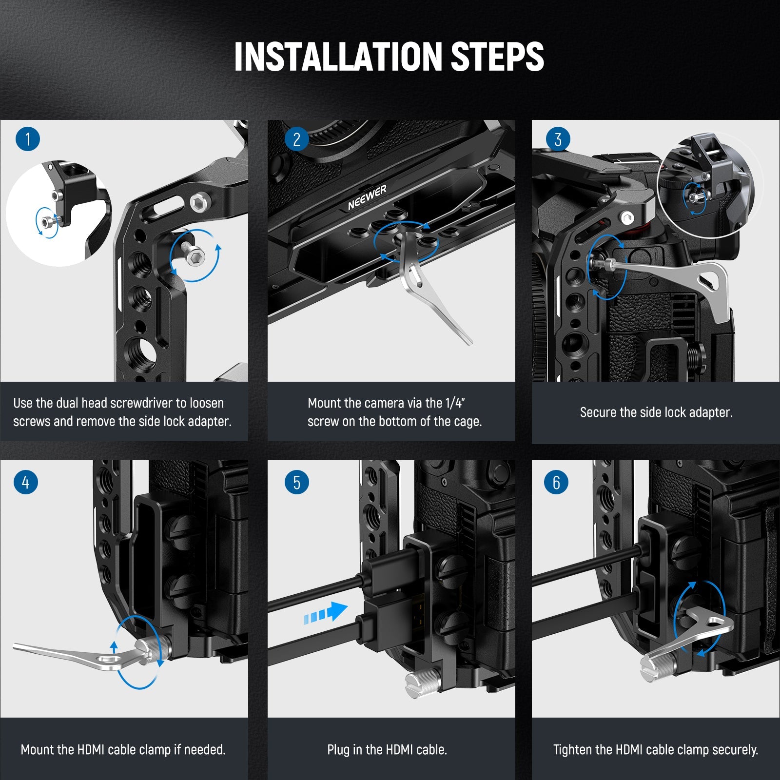 - Morsetto per cavo HDMI staccabile - Il morsetto per cavo rimovibile può fissare un cavo HDMI e un cavo USB di tipo C per trasferimenti di segnale stabili. Il morsetto è dotato di 2 viti, ciascuna con un tappetino in gomma per proteggere il connettore del cavo dai graffi. È incluso anche un cacciavite a doppia testa attaccato sotto la gabbia tramite magneti per l'installazione per il serraggio di ogni vite sulla gabbia