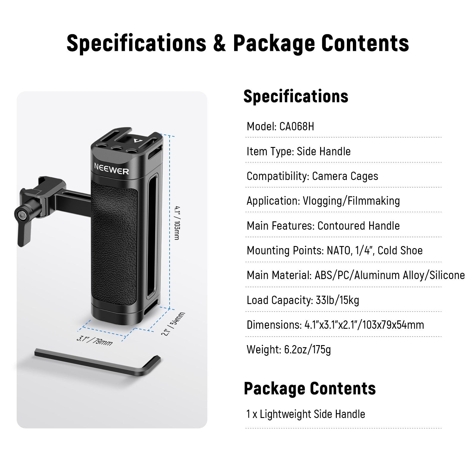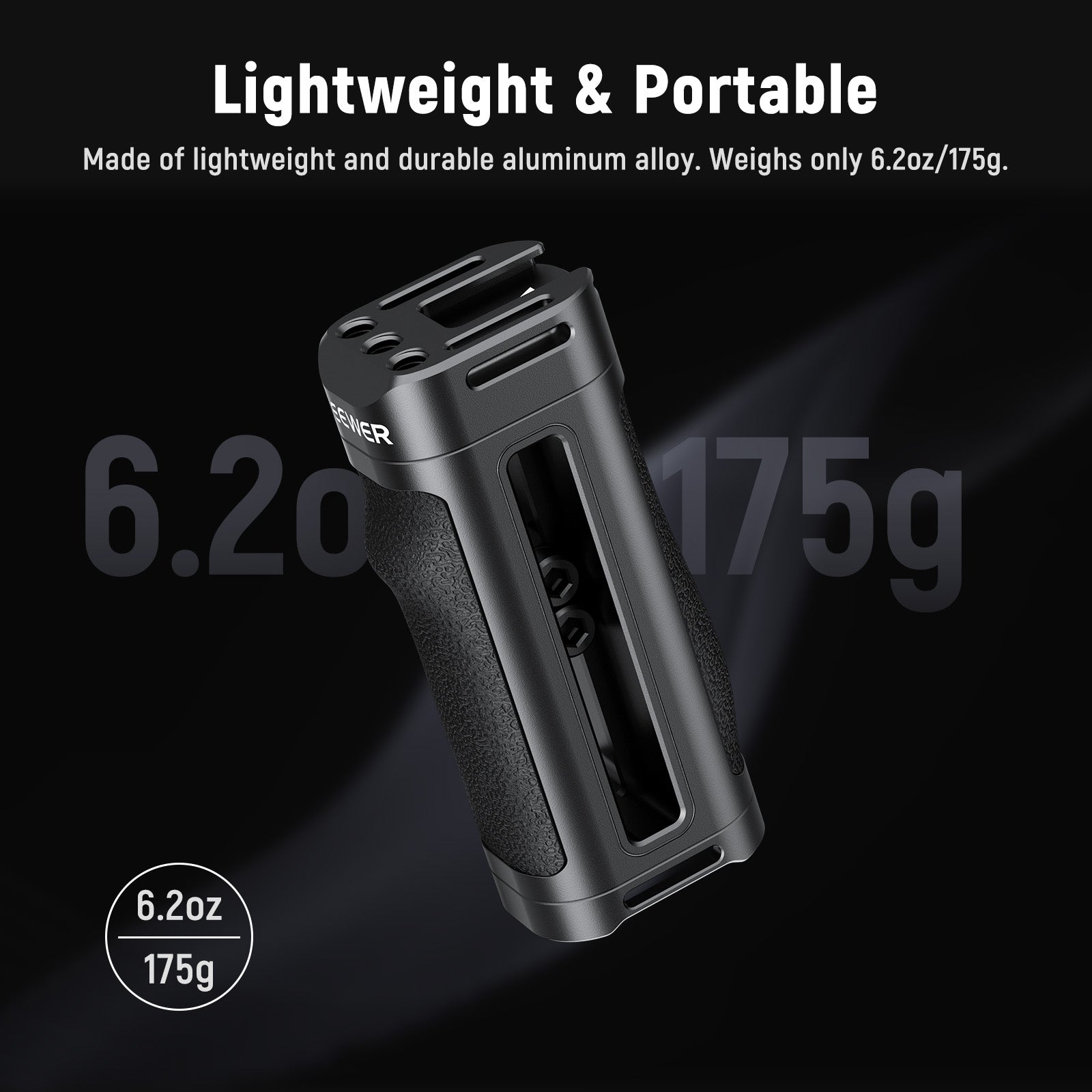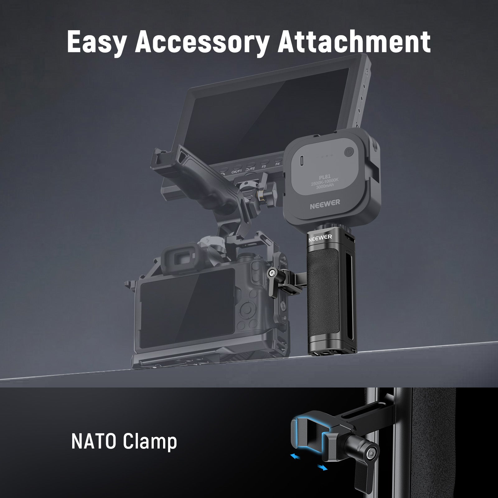 - Maniglia laterale NATO ultraleggera : questa mini maniglia laterale leggera (6,2 once/175 g) si collega alla gabbia della fotocamera o all'impianto video tramite il morsetto NATO. Ti aiuta a stabilizzare una fotocamera DSLR o mirrorless fino a 15 kg (33 libbre) ed è compatibile con le gabbie per fotocamera SmallRig e NEEWER (CA020 CA019 CA014 CA011 CA002) con binari NATO. Oppure puoi acquistare separatamente le guide NATO NEEWER UA003/UA007/UA022 per rendere qualsiasi gabbia fotografica completamente compatibile
