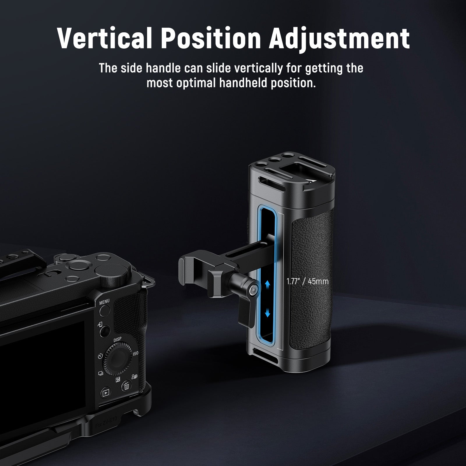 - Adatto per mano sinistra/destra - Progettato per il funzionamento con la mano sinistra e destra, il connettore della maniglia può essere staccato e installato su entrambi i lati della gabbia della fotocamera. Include anche uno slot per cordino per prevenire le cadute (cordino venduto separatamente)