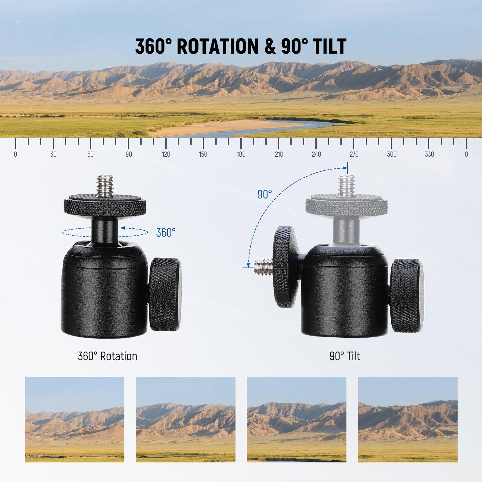 - 360° Ball Head & Height Adjustable- The trail camera stand features a 360° ball head on the main pole, allowing for 360 degree rotation and a 90 degree tilt. Use one or two connecting rods on the main pole to adjust its height to 27.6"/70 cm or 51.2"/130 cm. Elevating the camera off the ground reduces obstructions like tall grass or brush, enhancing the field of view and increasing the chances of capturing clear images or videos