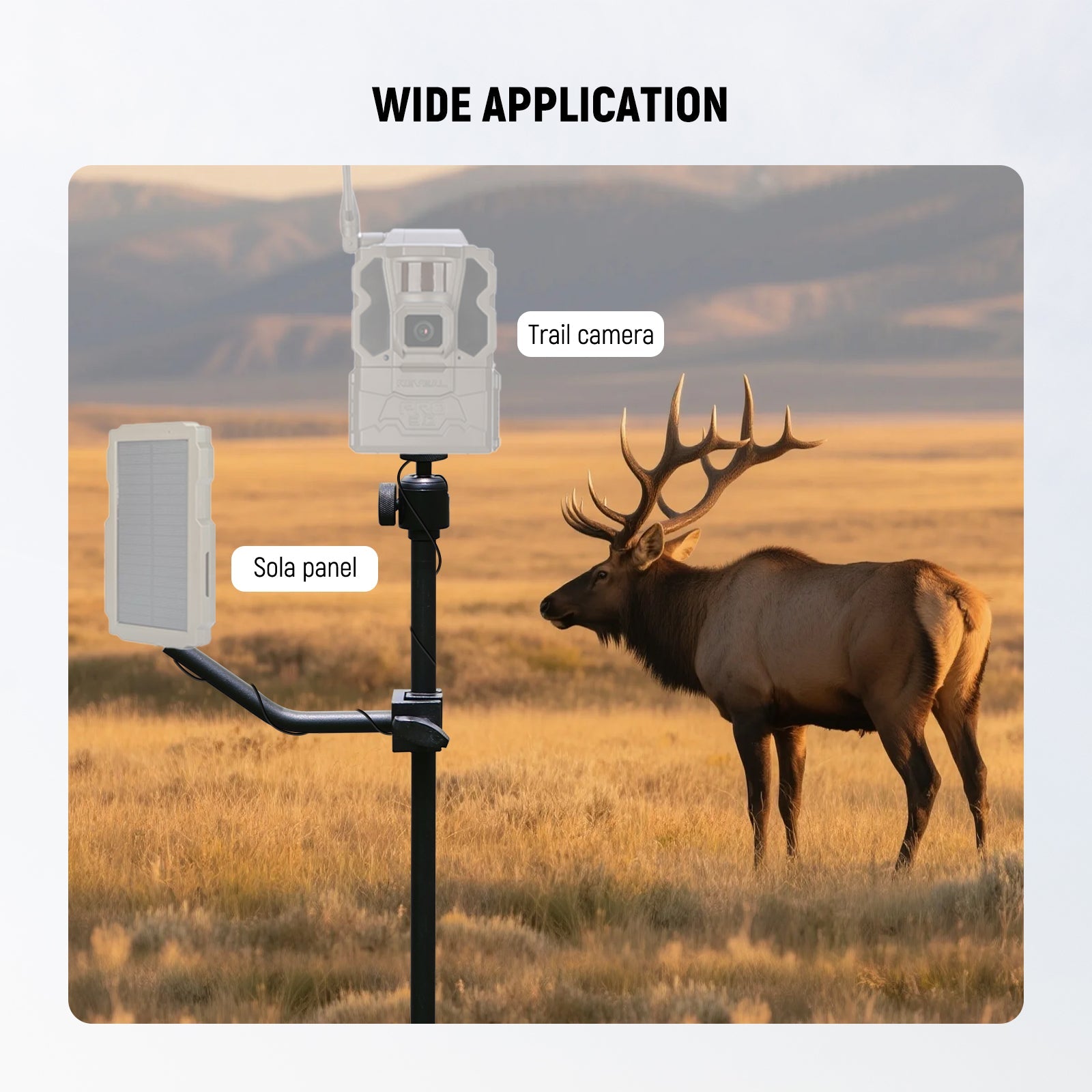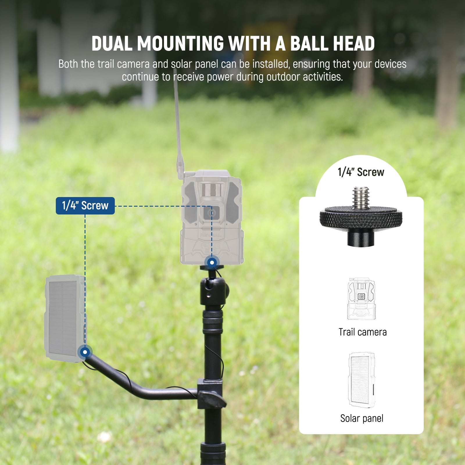 - 1/4" Screw & Versatile Use- With two mounting positions, the hunting camera mount features a 1/4" mounting screw on both the main pole and the side arm, enabling you to connect two devices simultaneously. You can install a camera and a solar panel, or a fishing light with a solar panel, ensuring your equipment stays powered during outdoor activities. It also allows for two cameras for multi angle shots, or supports a telescope at night, enhancing your stargazing experience