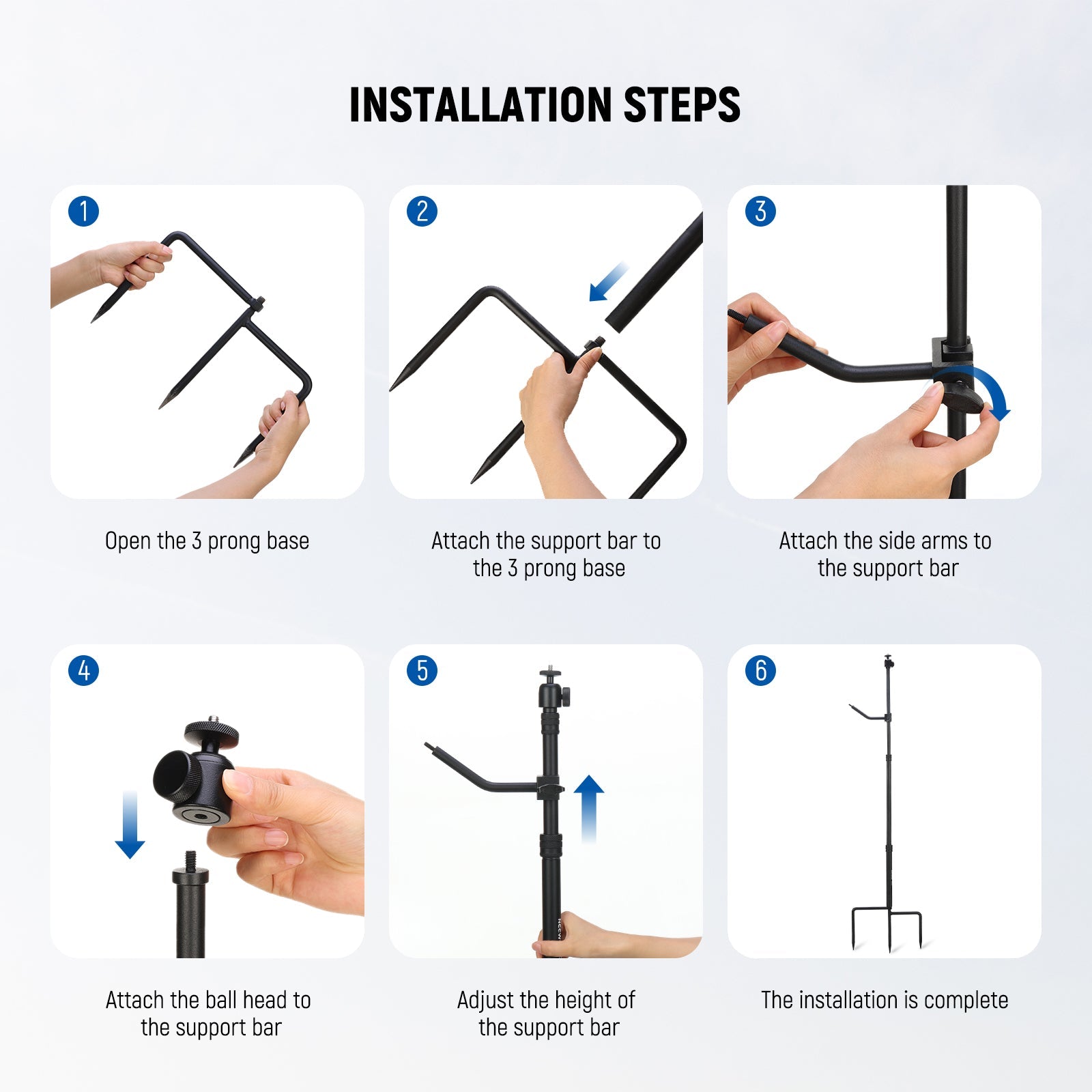 - Easy to Install- Twist to connect the two ball heads to the T post camera mount, and secure the side arm with butterfly screws, allowing for easy installation without additional tools - simply unpack and use. It can also be disassembled when necessary, making it convenient for transport and storage