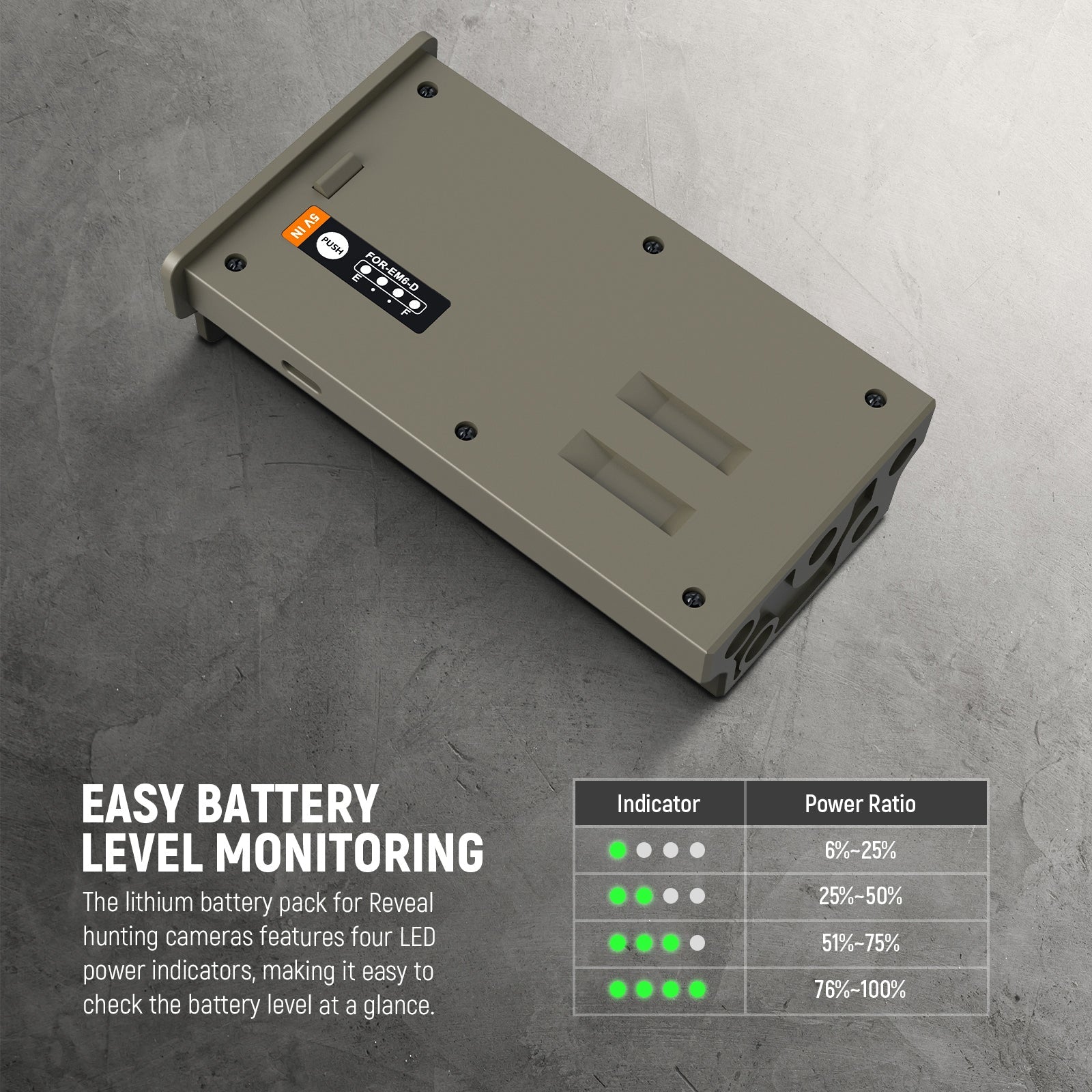 - Facile monitoraggio del livello della batteria : la batteria al litio per le fotocamere da caccia Reveal è dotata di quattro indicatori di alimentazione a LED, che consentono di controllare facilmente il livello della batteria a colpo d'occhio. In questo modo, sarai sempre a conoscenza della carica residua, così non sarai mai colto di sorpresa durante le tue avventure all'aria aperta.