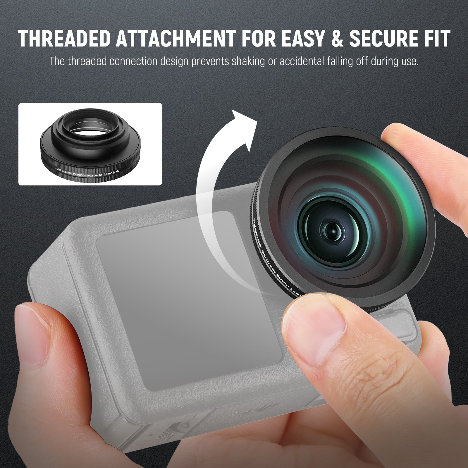 - Attacco filettato per un fissaggio facile e sicuro - Grazie al design con attacco filettato, questo obiettivo grandangolare garantisce una connessione salda e sicura alla tua Osmo Action 5 Pro, prevenendo oscillazioni o distacchi accidentali durante l'uso. È inoltre facile da rimuovere quando non in uso e può essere riposto in sicurezza nella custodia in silicone inclusa.