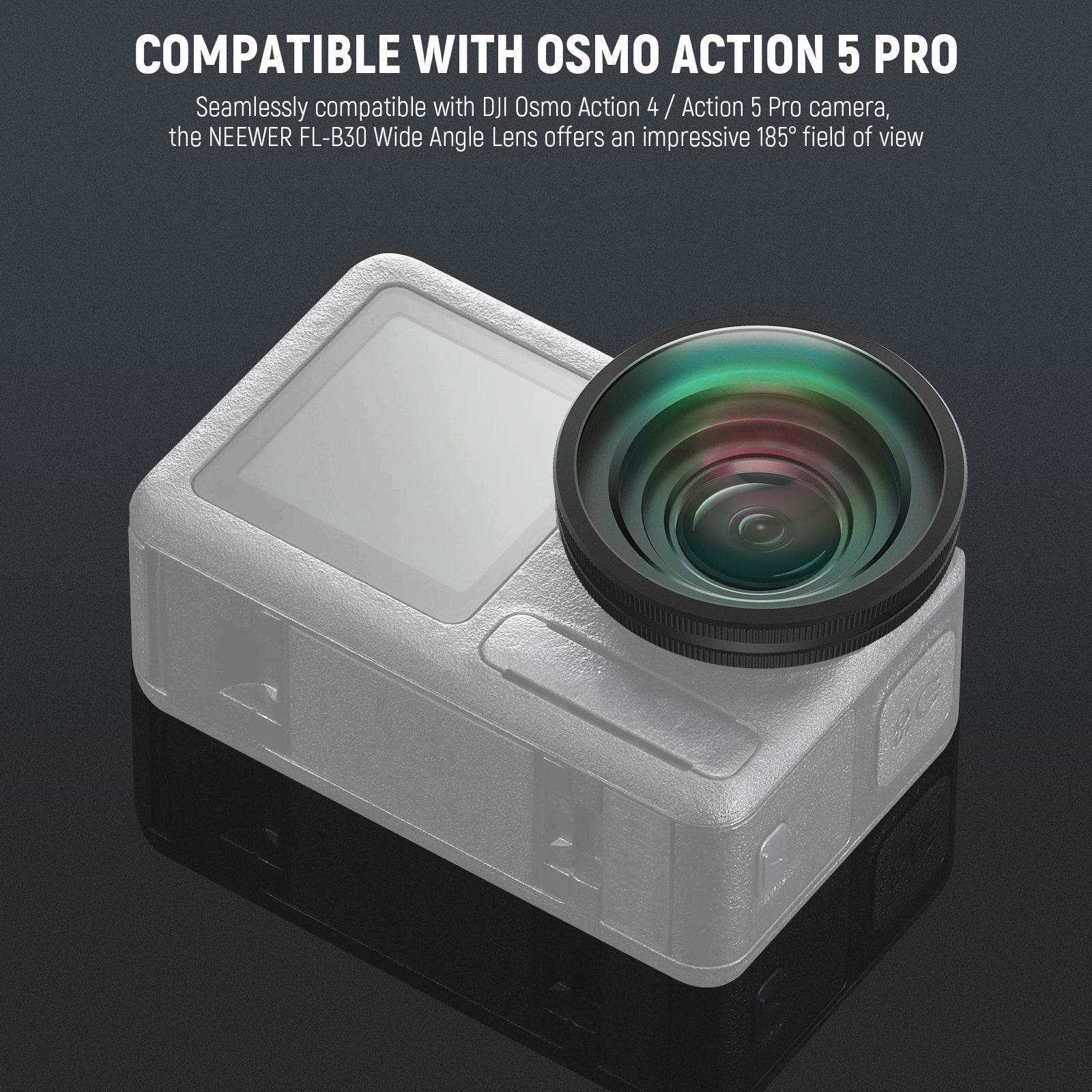 - Progettato su misura per Osmo Action 5 Pro - Perfettamente compatibile con la fotocamera DJI Osmo Action 4 / Action 5 Pro, l'obiettivo grandangolare FL-B30 di NEEWER offre un impressionante campo visivo di 185°, catturando ogni dettaglio all'interno dell'inquadratura per elevare la tua creatività e migliorare la tua esperienza fotografica complessiva. Ideale come accessorio fotografico essenziale per i creatori di contenuti e come accessorio indispensabile per gli influencer.