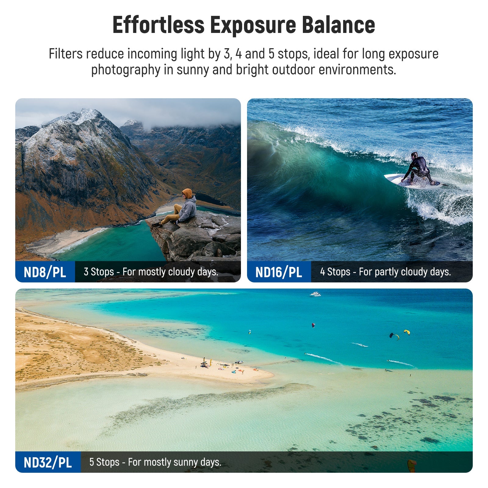 - Combinazione di filtri ND e PL - Tre filtri ND/PL (ND8/PL, ND16/PL, ND32/PL) riducono la luce rispettivamente di 3, 4 e 5 stop. Combinano effetti ND e polarizzanti, consentono un controllo preciso dell'esposizione e migliorano colore, contrasto e dettagli nelle immagini, riducendo efficacemente abbagliamento e riflessi. Semplificando il flusso di lavoro, sono ideali per la registrazione video all'aperto e la fotografia paesaggistica