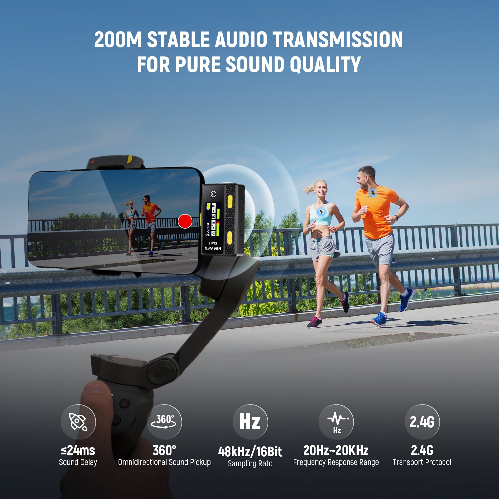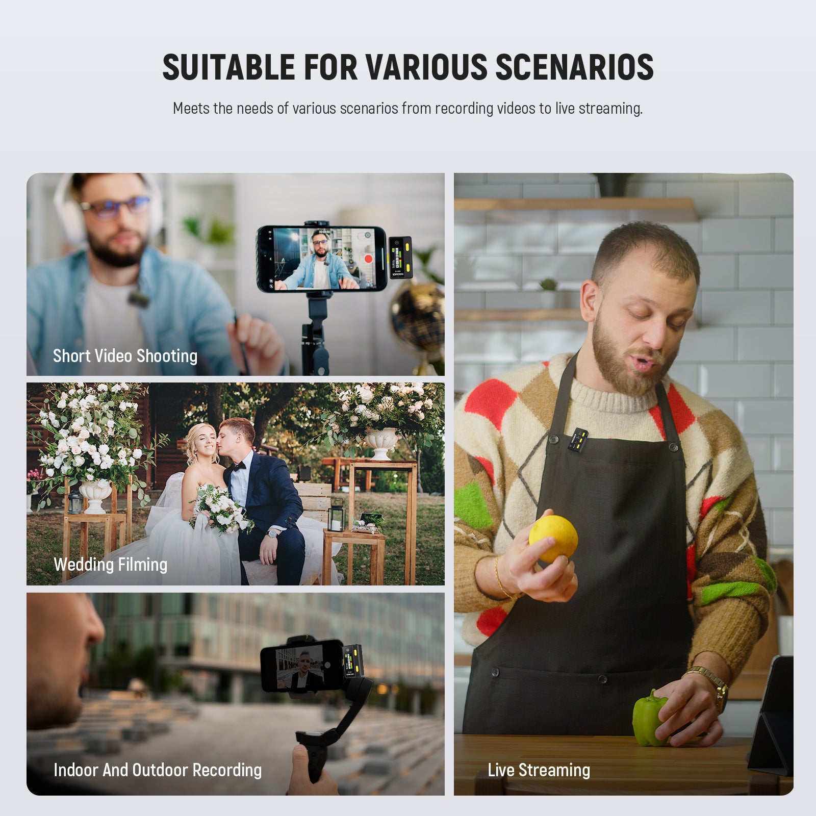 - Alta fedeltà - Con un'elevata frequenza di campionamento e fedeltà del suono, questi microfoni wireless da maglietta o portatili possono filtrare il rumore al massimo. Mentre ottengono la commutazione della modalità canale con un clic e la riduzione del rumore, mantengono anche il suono nitido. Può essere ampiamente utilizzato nella registrazione video, nei vlog, nelle trasmissioni in diretta all'aperto e al chiuso, ecc. I parabrezza nella confezione riducono efficacemente i rumori esterni
