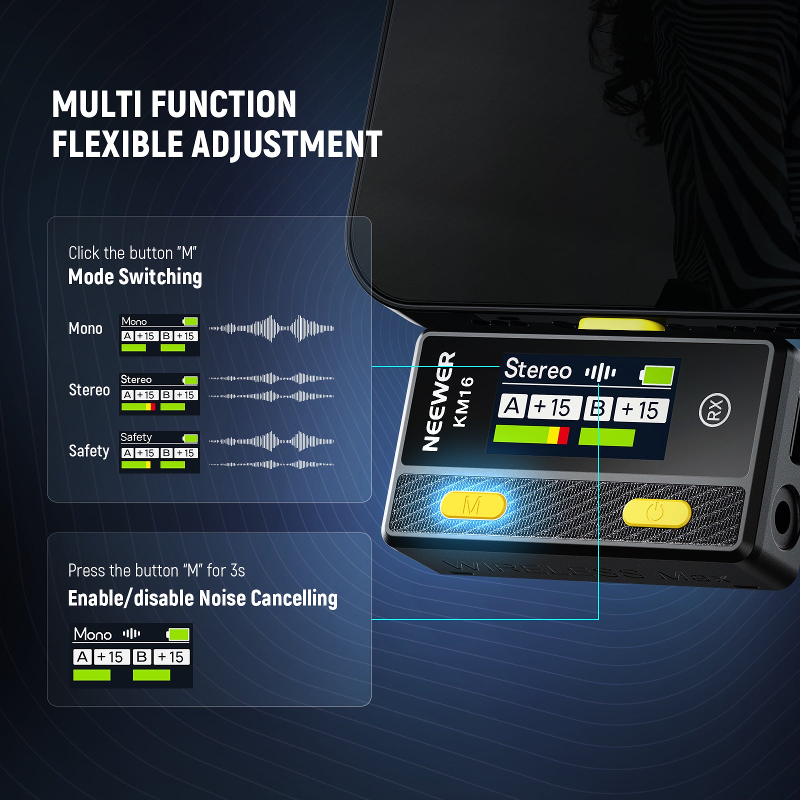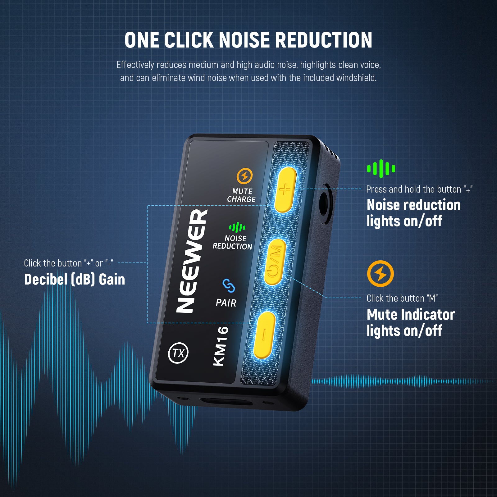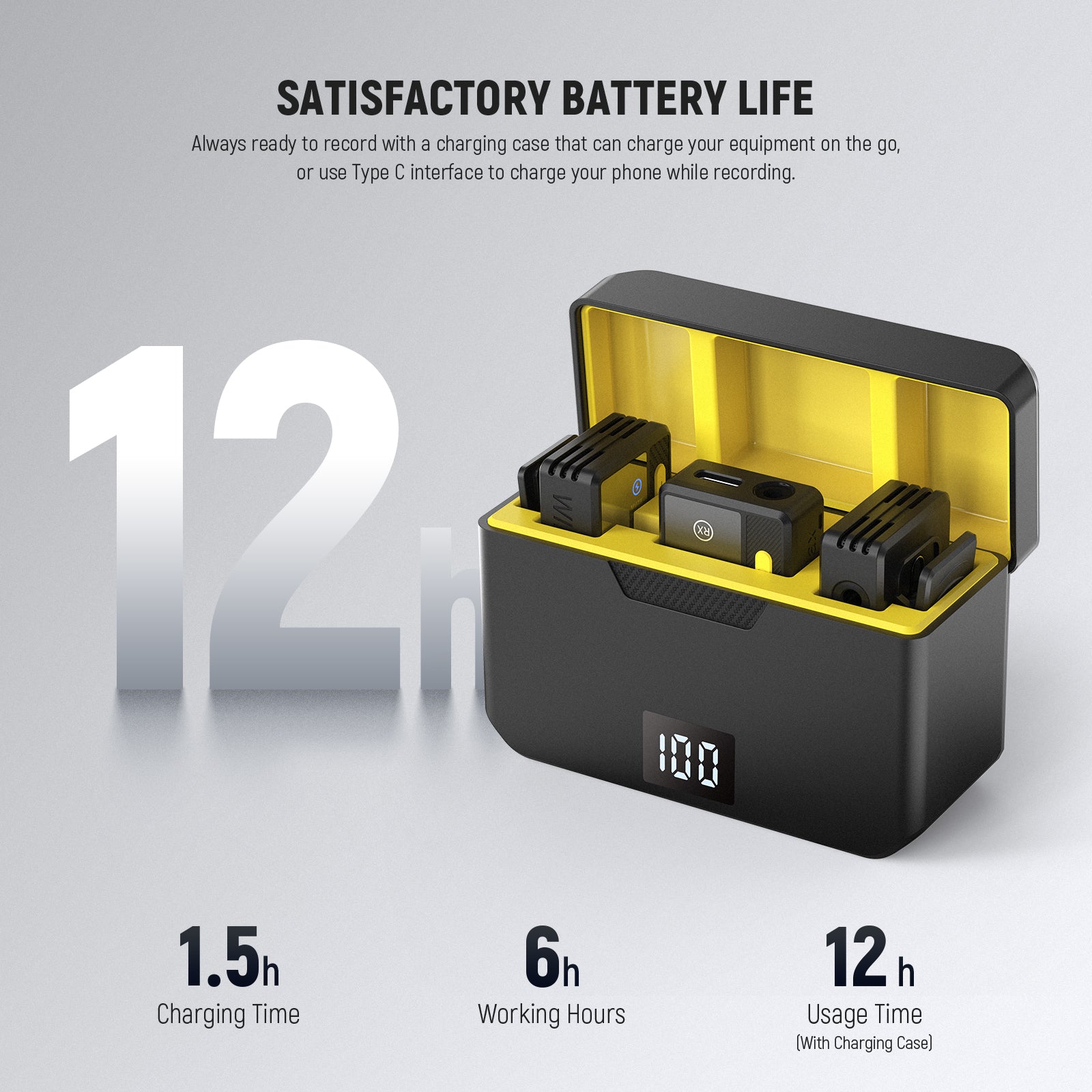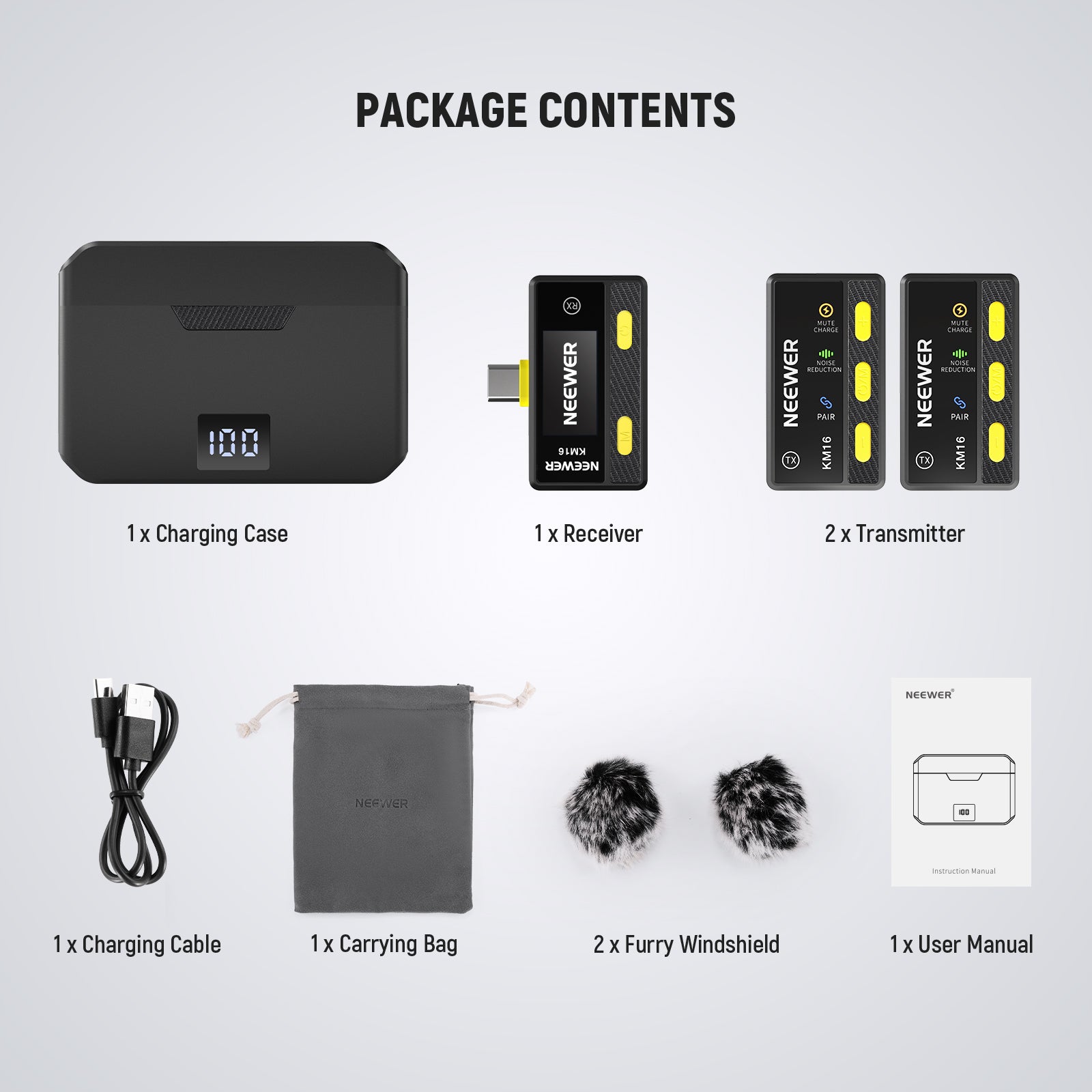 - Durata della batteria di 12 ore - A differenza dei microfoni tradizionali, il KM16 è dotato di una custodia di ricarica. La custodia di ricarica può caricare completamente RX/TX e possono durare per 6 ore dopo essere stati completamente caricati. La durata totale della batteria del prodotto è fino a 12 ore. C'è un display di alimentazione sulla custodia di ricarica e l'RX ha un display e una porta di monitoraggio da 3,5 mm. La custodia di ricarica compatta e portatile supporta la ricarica sempre e ovunque