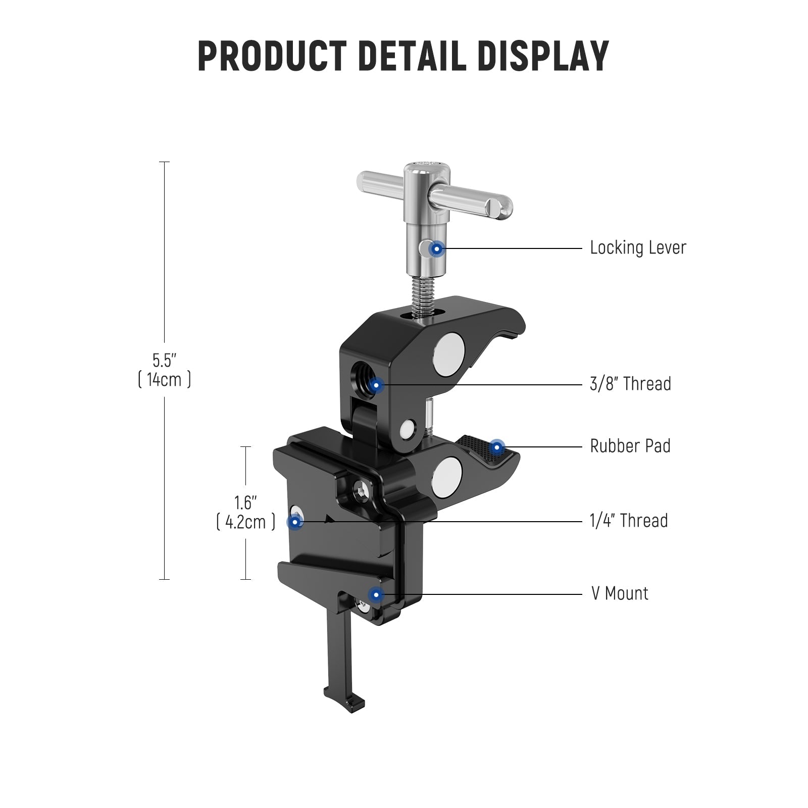 - Apertura della bocca più ampia: con un'apertura massima di 2" (50 mm), il morsetto a forma di V può essere fissato su superfici piane e curve o agganciato a un'asta, un tubo e un supporto leggero o un supporto a C con una resistenza incredibile