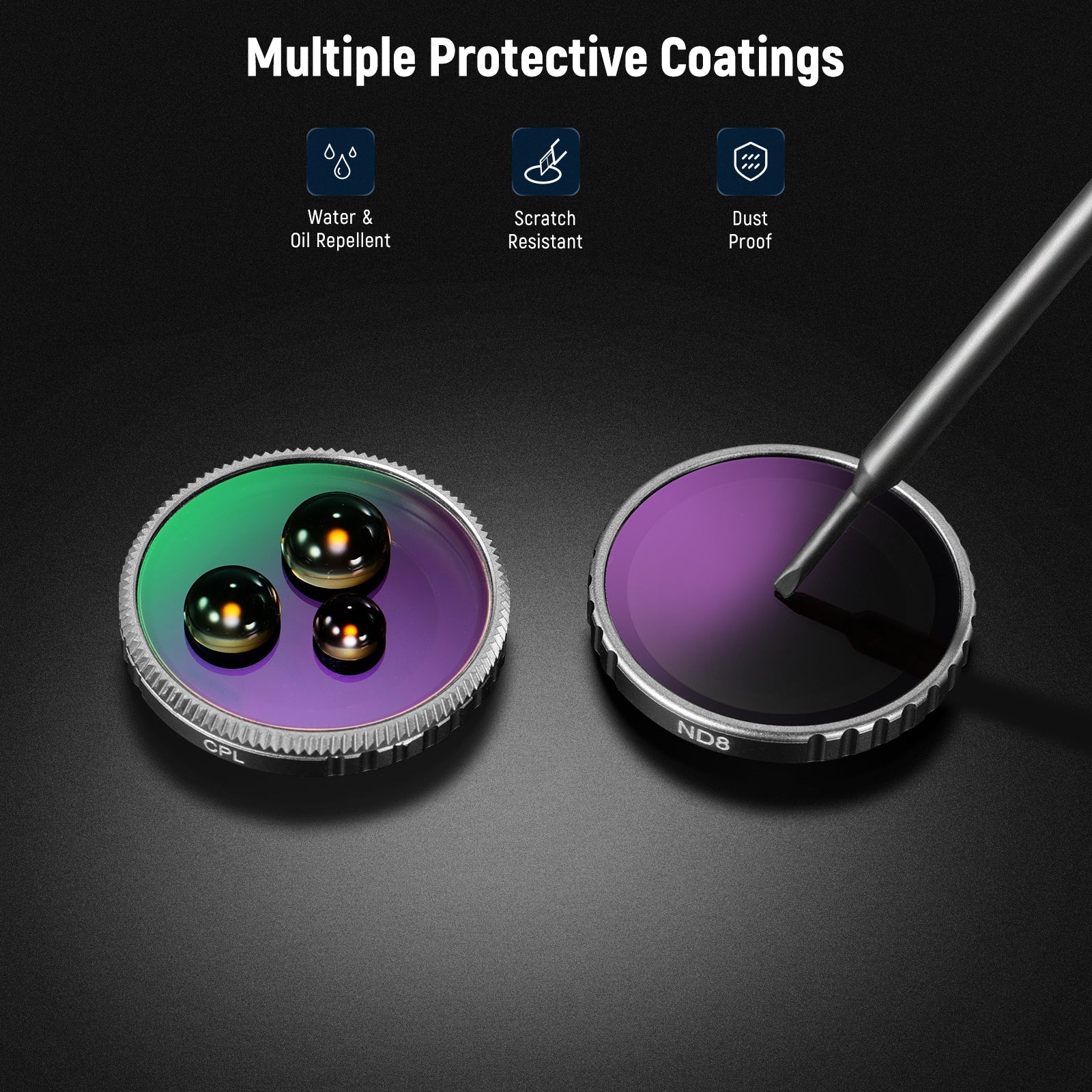 - Vetro ottico premium con rivestimento nano - Realizzati in vetro ottico ad alta definizione, questi filtri sono dotati di 30 strati di rivestimento nano su entrambi i lati, offrendo una protezione robusta contro polvere, olio, impronte digitali e graffi riducendo al minimo i riflessi