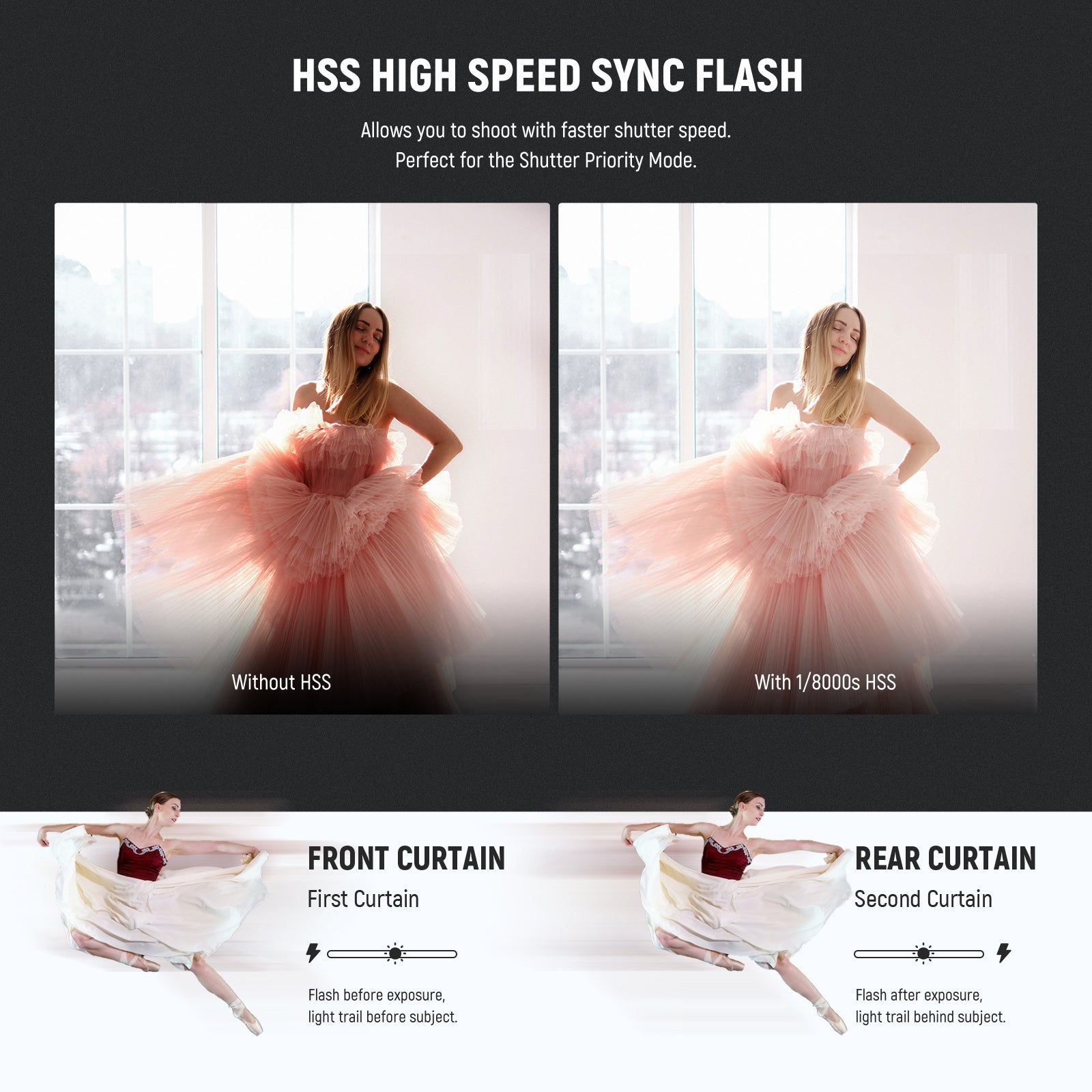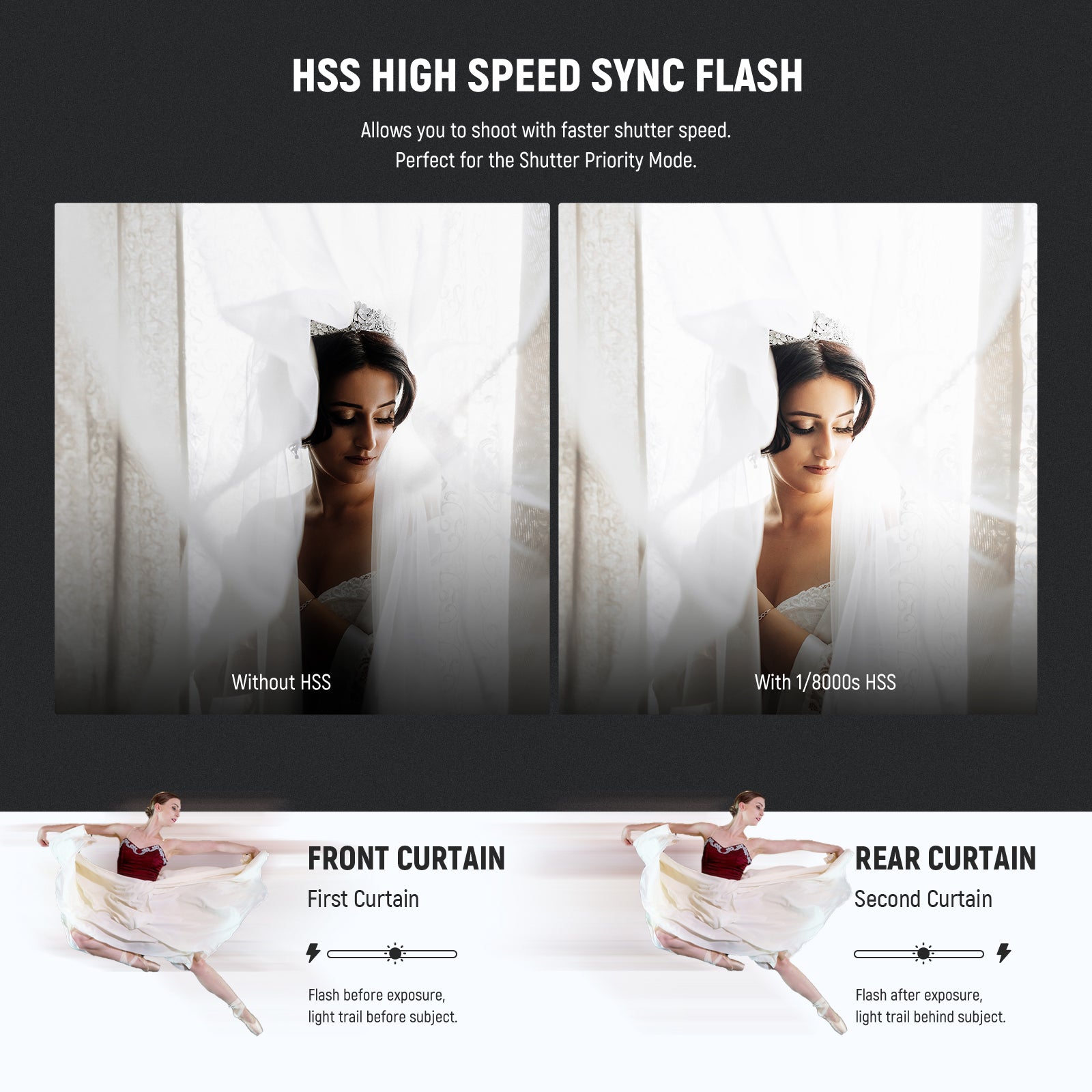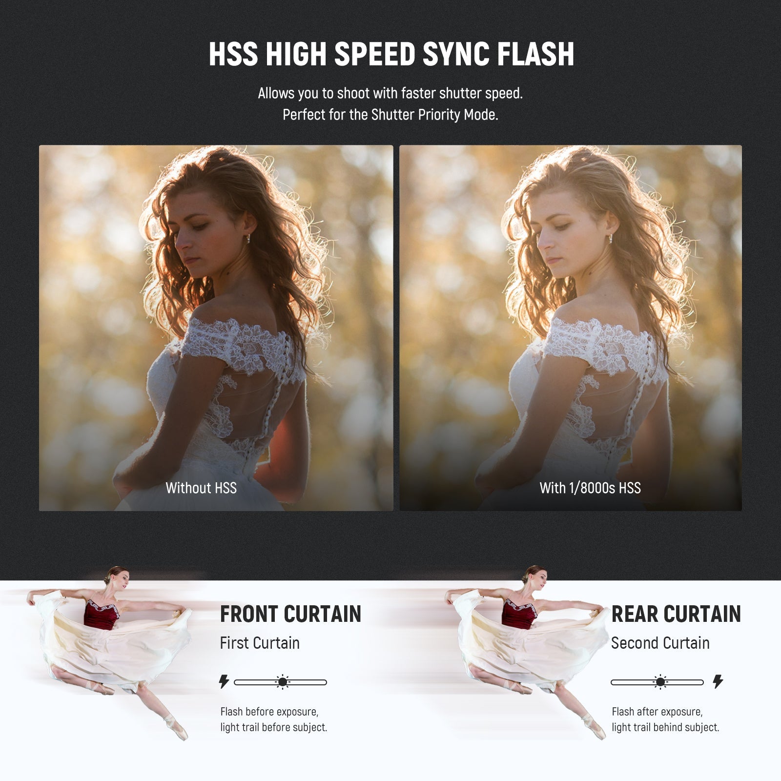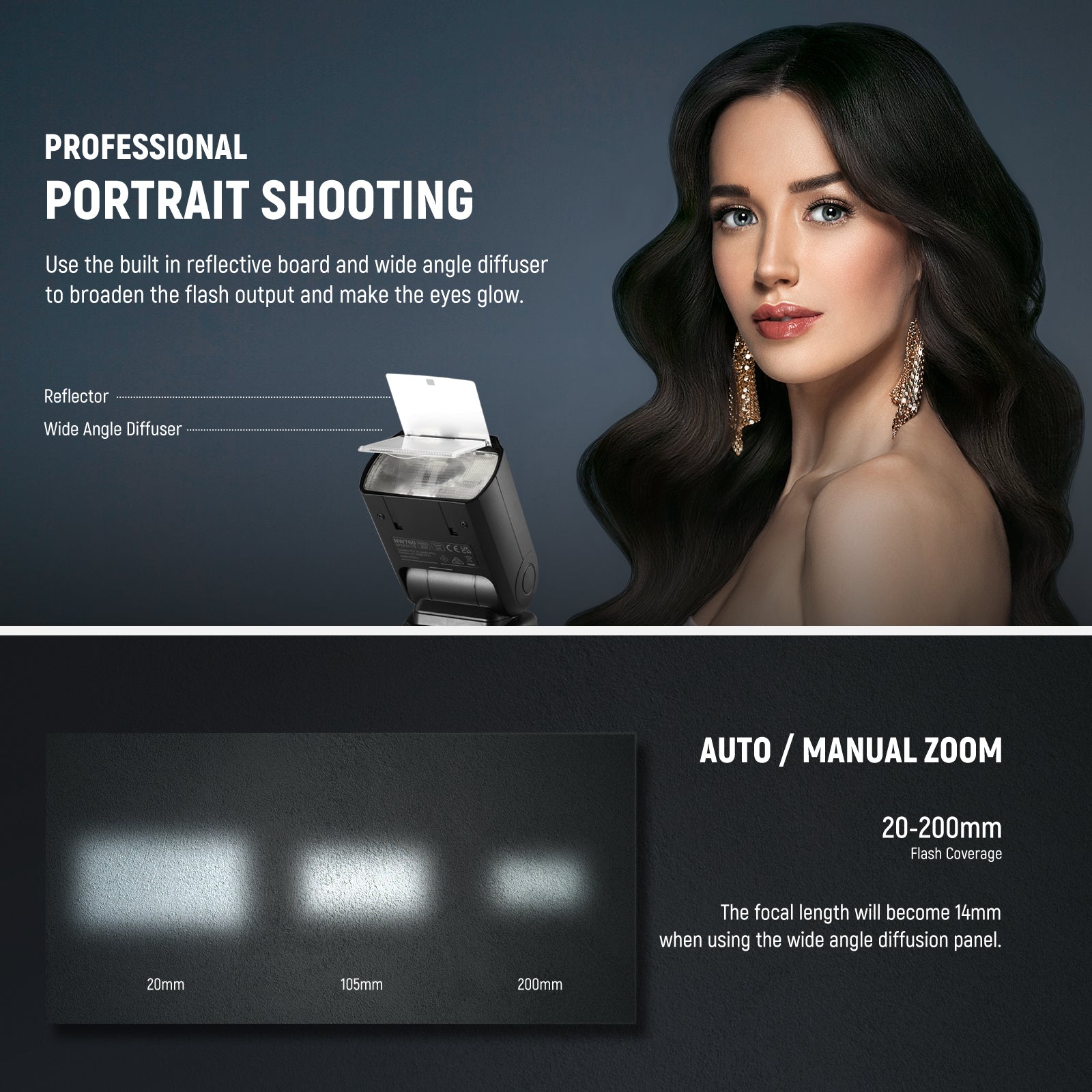 - Angoli ed effetti flash flessibili - La testa del flash supporta inclinazioni da -7° a 120° e rotazione a 360° per rimbalzi e riflessi flash flessibili. Il riflettore incluso e il pannello di diffusione grandangolare possono far brillare gli occhi e ampliare la copertura del flash per un risultato morbido e naturale. Lo schermo LCD HD consente la personalizzazione, lo standby, il raggio di assistenza alla messa a fuoco automatica e la retroilluminazione per un funzionamento conveniente