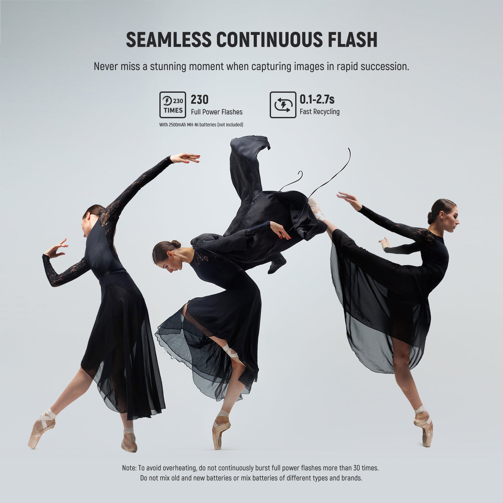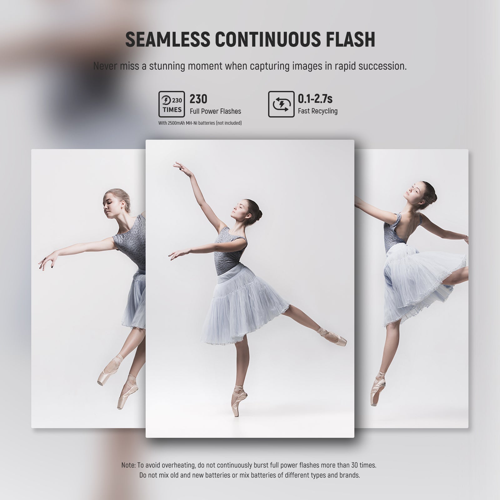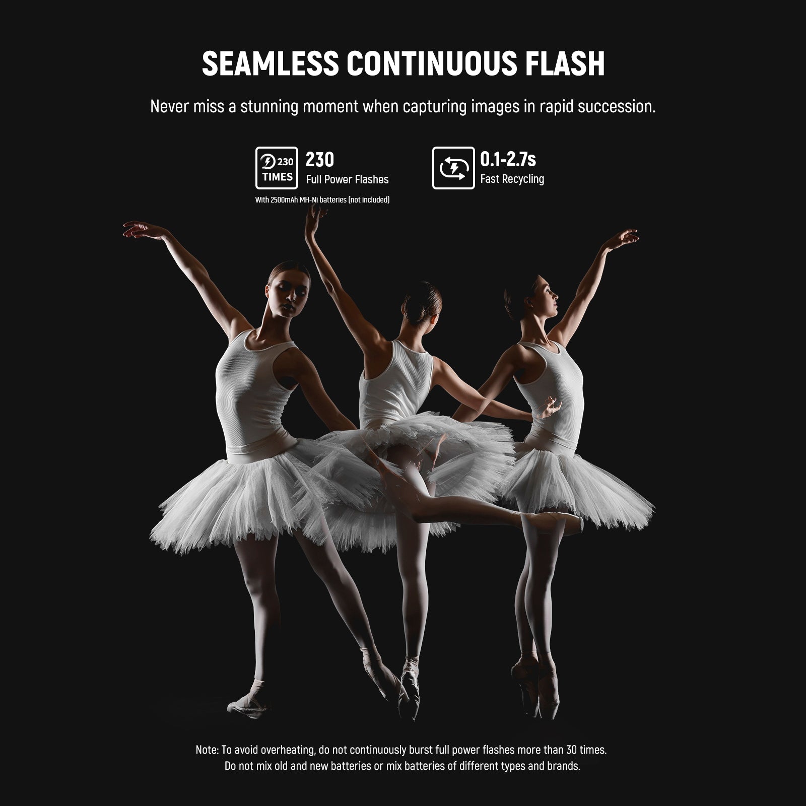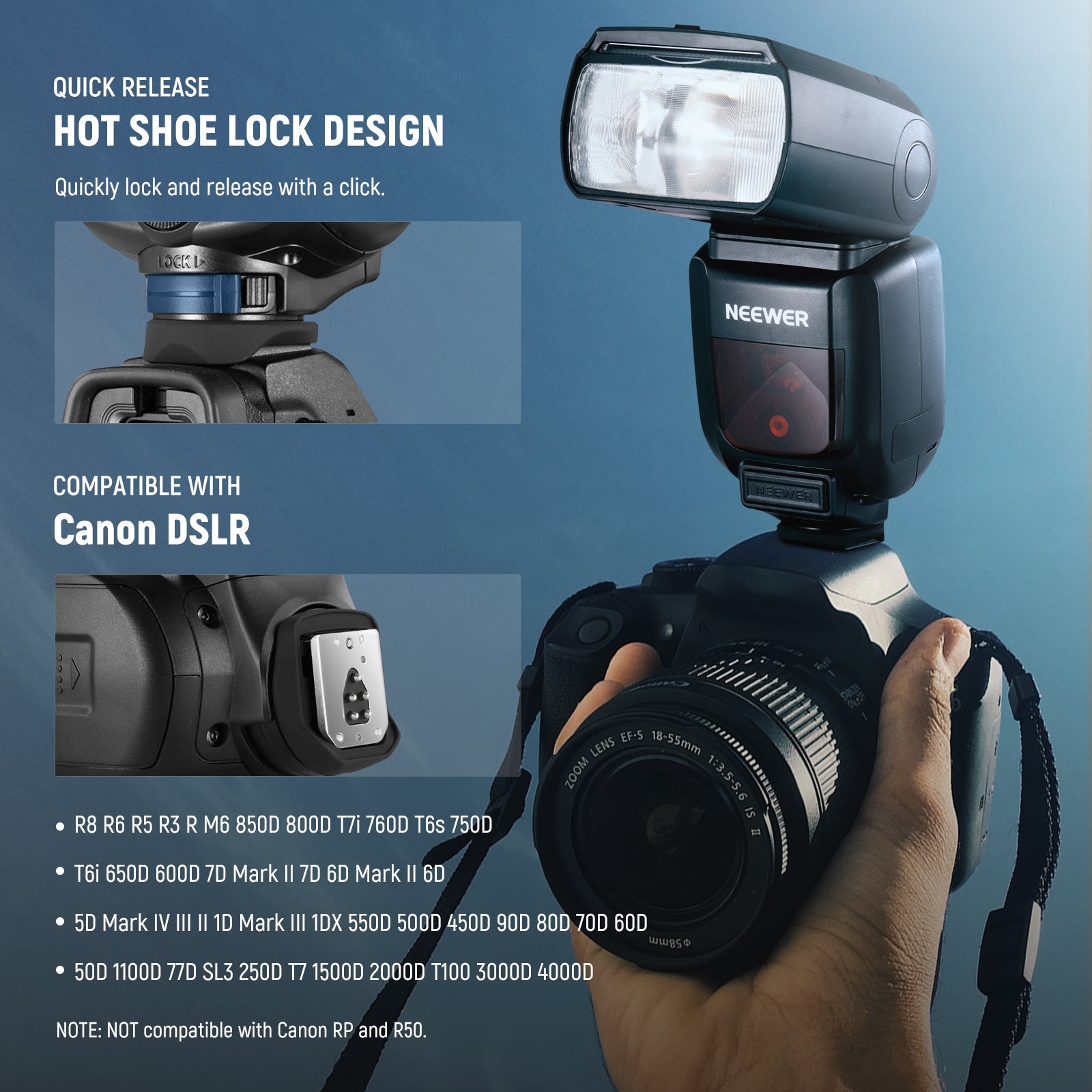 - Modalità flash TTL/M/MULTI - Costruito con modalità E-TTL II (auto), M (manuale) e MULTI (stroboscopica). La modalità M supporta 81 livelli di potenza flash (1/256-1/1) con un interruttore TCM per convertire rapidamente tra TTL e M. Supporta anche sincronizzazione ad alta velocità HSS 1/8000s, tempo di riciclo 0,1-2,7s, durata flash 1/300s-1/20000s, 100 flash stroboscopici (199Hz), compensazione dell'esposizione flash (FEC), bracketing dell'esposizione flash (FEB), blocco dell'esposizione flash (FEL), sincronizzazione anteriore/posteriore e S1/S2 ottico