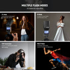 - Sistema Q wireless 2.4G integrato - Costruito con il sistema NEEWER 2.4GQ, il flash ha 4 gruppi master (A/B/C/D), 5 gruppi slave (A/B/C/D/E, E per i trigger della serie QPro), 32 canali (1-32) e 99 ID (1-99). Compatibile con il trigger QPro-C TTL (venduto separatamente) per il controllo wireless del flash. Può funzionare come flash master/slave per controllare o essere controllato da altri flash del sistema Q in un raggio di 328'/100m (senza ostacoli) per diversi effetti