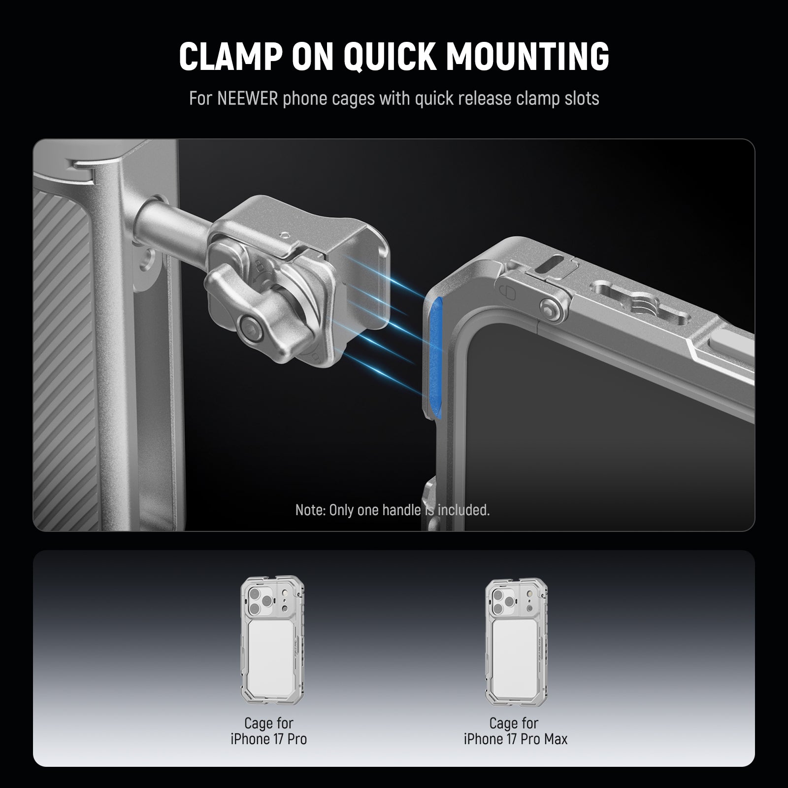- Installazione con morsetto a sgancio rapido : dotata di un morsetto a sgancio rapido, la maniglia laterale può essere rapidamente fissata alla gabbia del telefono e fissata con una rotazione della manopola di bloccaggio, perfetta per registrazioni video all'aperto, riprese cinematografiche, vlog, streaming live, fotografia mobile e altre attività in cui il tempo è prezioso.