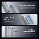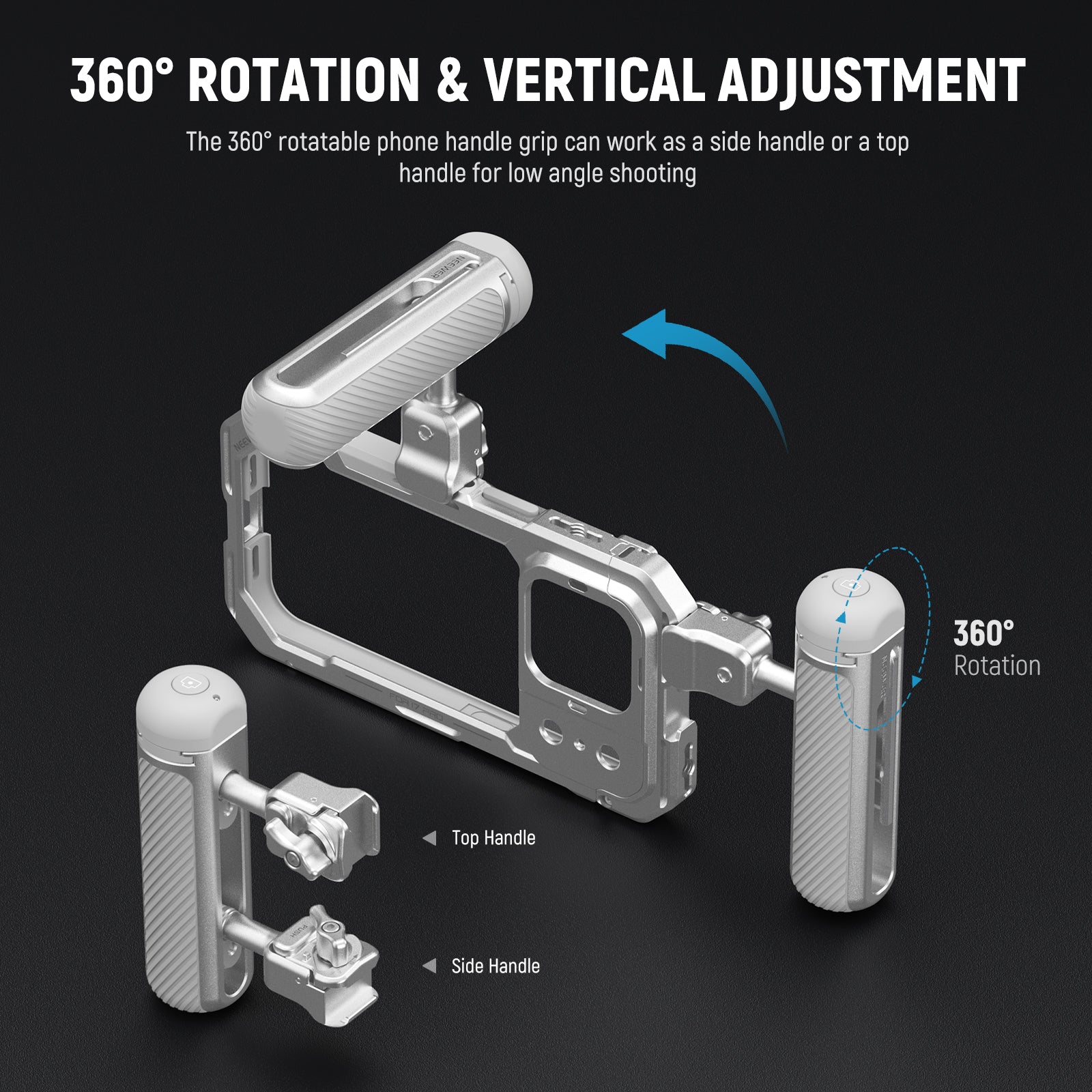 - Rotazione a 360° e regolazione verticale : con una rotazione a 360°, l'impugnatura del telefono può fungere anche da maniglia superiore per scatti da angolazioni basse. La regolazione verticale di 2,2"/55 mm consente un migliore bilanciamento