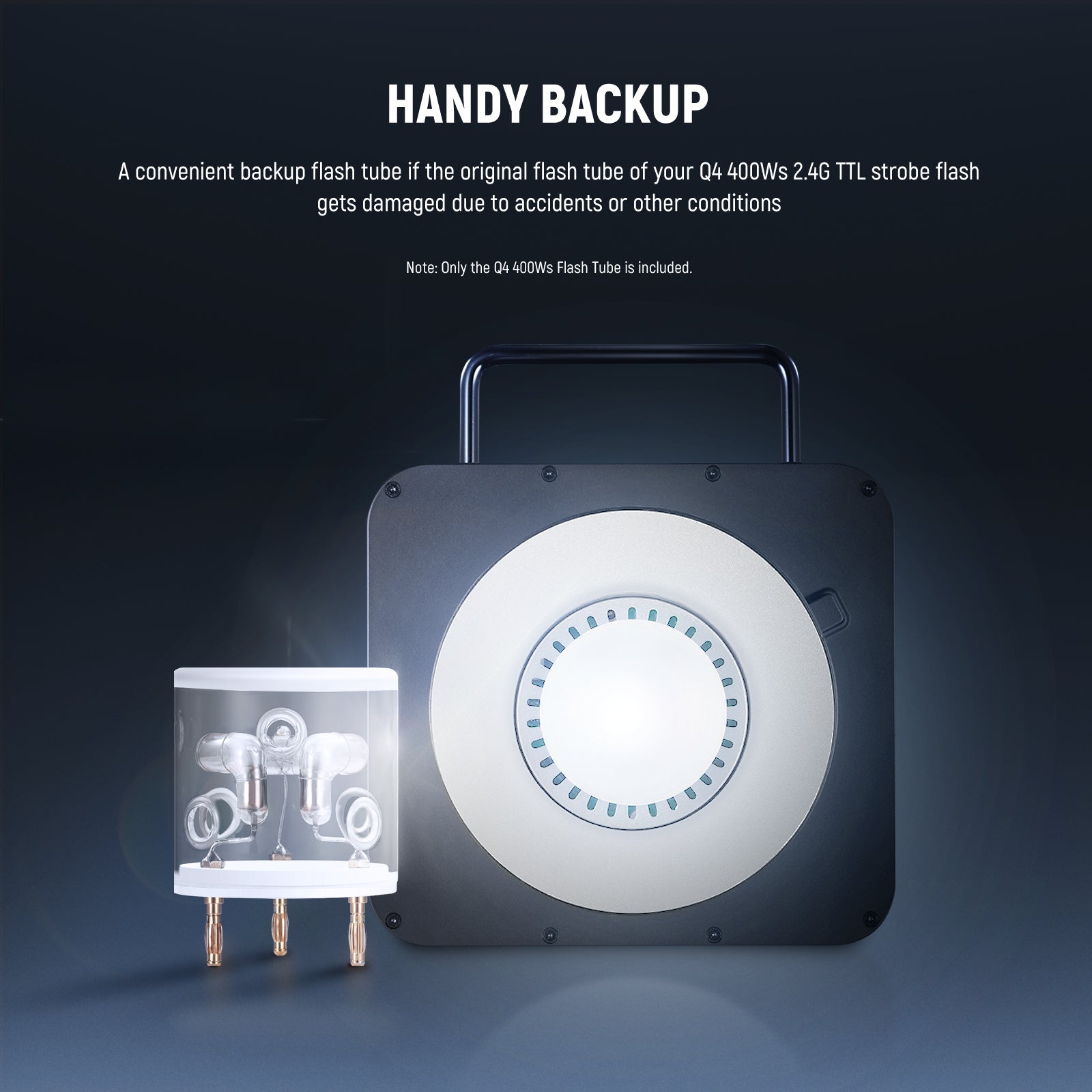 - Handy Backup - Un comodo tubo flash di riserva se il tubo flash originale del tuo flash stroboscopico Q4 400Ws 2.4G TTL viene danneggiato a causa di incidenti o altre condizioni