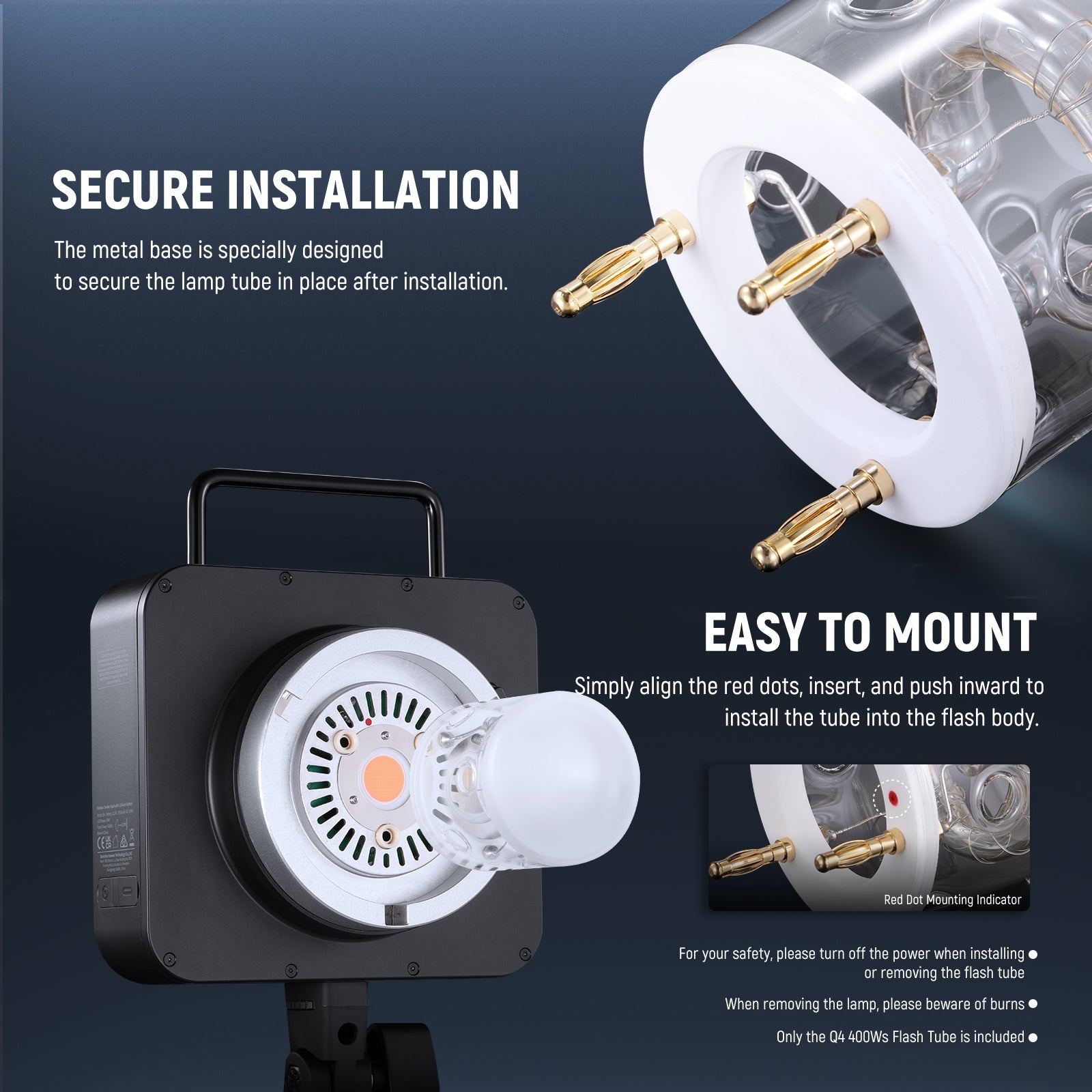 - Uscita flash da 400 W : il tubo flash fornisce un'illuminazione uniforme e potente con 400 W di potenza del flash, la stessa del tubo originale, e supporta fino a centinaia e migliaia di flash a piena potenza.
