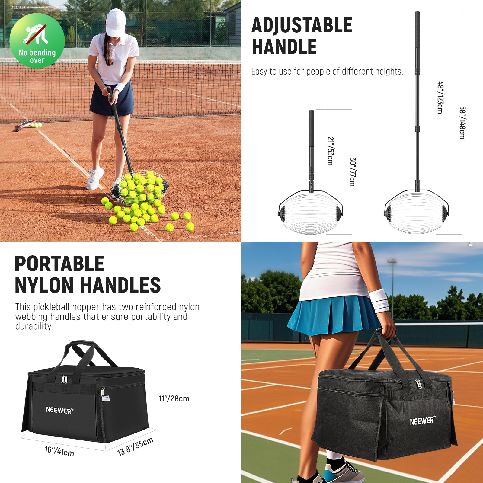 - Raccolta rapida delle palline senza piegamenti - Sei stanco di chinarti frequentemente per raccogliere le palline durante un allenamento? Bene, questo raccoglipalline da tennis ergonomico con un lungo manico ti viene in aiuto! Basta farlo rotolare sulle palline per raccoglierle nel raccoglitore, senza piegarti, senza accovacciarti e senza sforzare la schiena. Il rullo ellittico ruota fluidamente per una raccolta efficiente delle palline e funziona bene su erba, terra battuta, legno duro o altre superfici dure.
