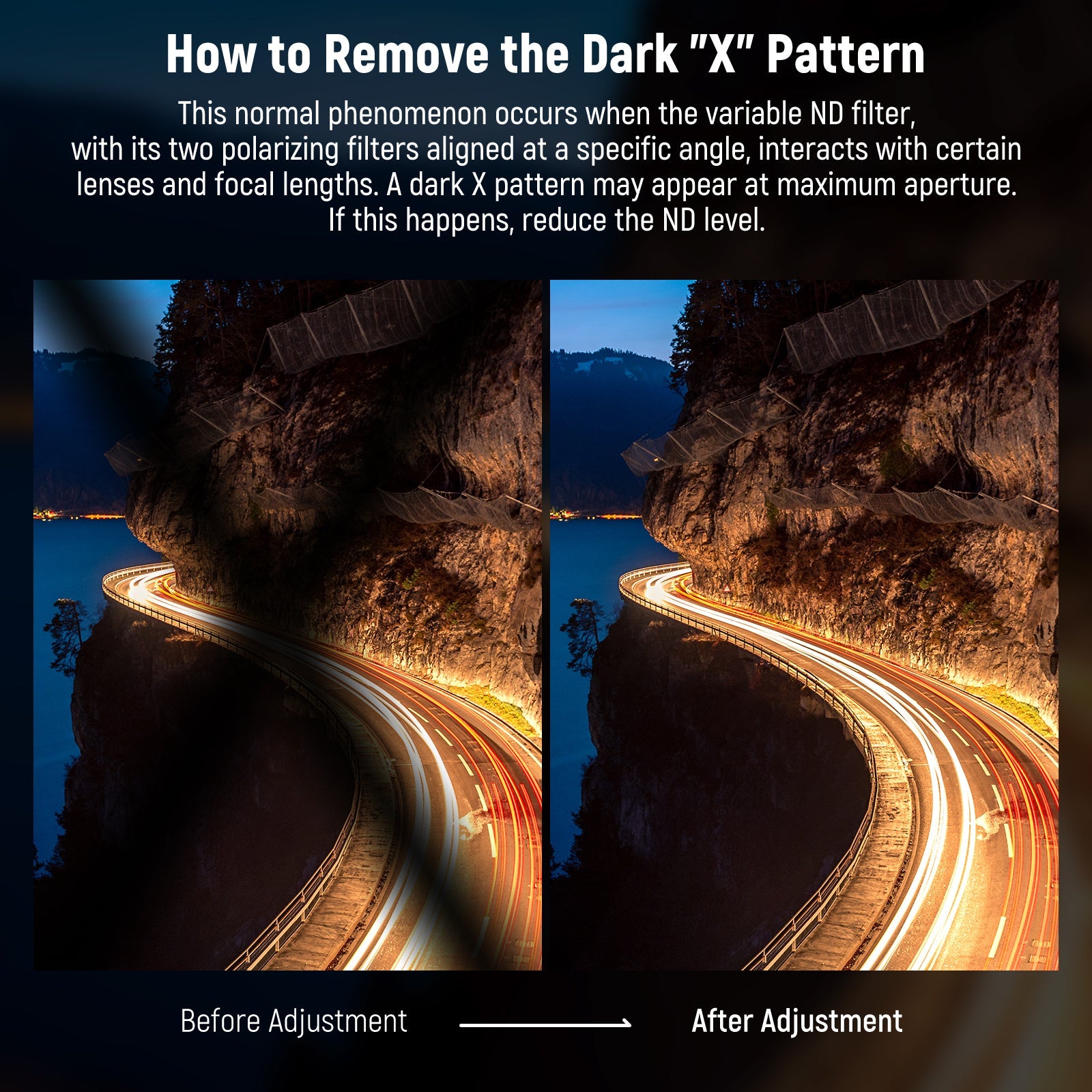 - Come rimuovere il pattern "X" scuro - Un pattern X scuro, noto anche come vignettatura a forma di X, può apparire alla massima apertura. Questo fenomeno normale si verifica quando il filtro ND variabile, con i suoi due filtri polarizzanti allineati a un angolo specifico, interagisce con determinate lenti e lunghezze focali. Per risolvere questo problema, ridurre i valori di densità neutra ruotando il filtro verso il segno minimo