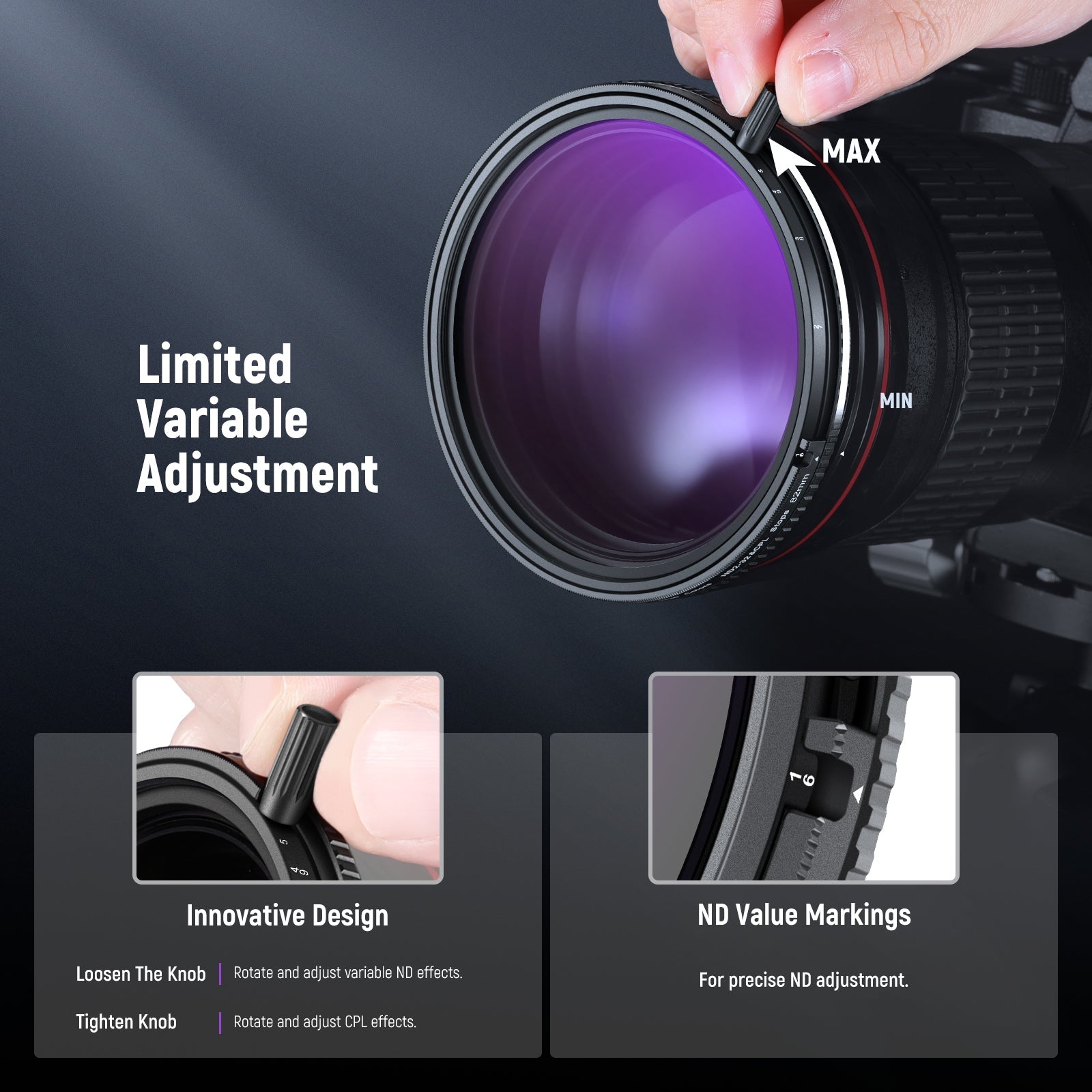 - Regolazione innovativa con una manopola : regola il filtro polarizzatore circolare bloccando la manopola e ruotandola. Allenta la manopola per modificare la riduzione della luce ND da ND2 a ND32 o da ND64 a ND512 con il filtro magnetico ND32. Ciò consente la riduzione dell'abbagliamento e la regolazione della luce in un unico movimento. Nota: il filtro magnetico ND32 non può funzionare in modo indipendente e non presenta filettature per accessori