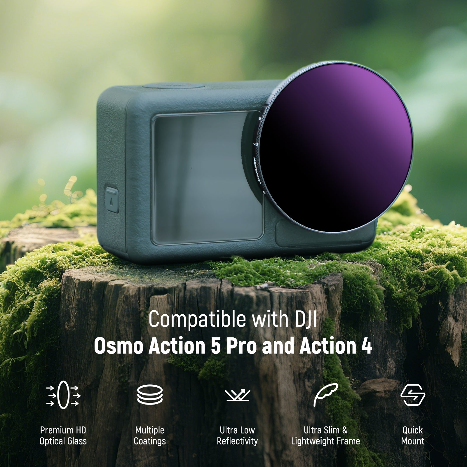 - Per Action 5 Pro e Action 4 - Compatibile con DJI Osmo Action 5 Pro e Action 4 Adventure Combo, questo filtro a densità neutra variabile è ideale per un'ampia gamma di attività sportive, tra cui surf, kayak, sci, mountain bike, paracadutismo, skateboard ed escursionismo come accessori fotografici essenziali per i creatori di contenuti e attrezzatura indispensabile per gli influencer