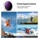 - Controllo dell'esposizione facile e preciso : il filtro ND8-32 variabile offre 3-5 stop di riduzione della luce regolabile per diverse condizioni di illuminazione. È sufficiente ruotare la cornice esterna fino ai punti di riferimento per un bilanciamento dell'esposizione preciso e per catturare il movimento con un effetto motion blur dinamico.