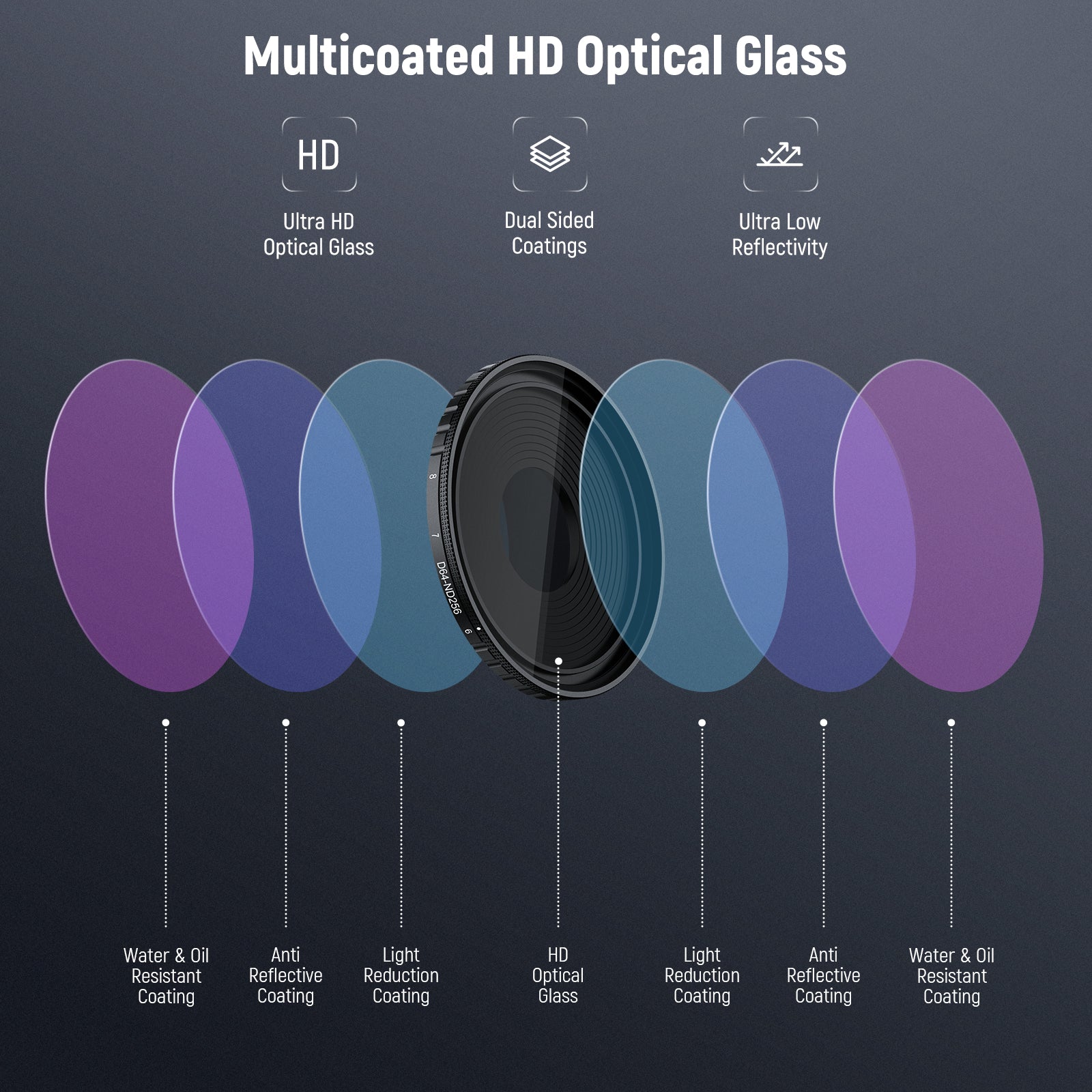 - Controllo dell'esposizione facile e preciso : il filtro ND64-256 variabile offre 6-8 stop di riduzione della luce regolabile per diverse condizioni di illuminazione. È sufficiente ruotare la cornice esterna fino ai riferimenti esatti per un bilanciamento dell'esposizione accurato e catturare il movimento con un effetto motion blur dinamico.
