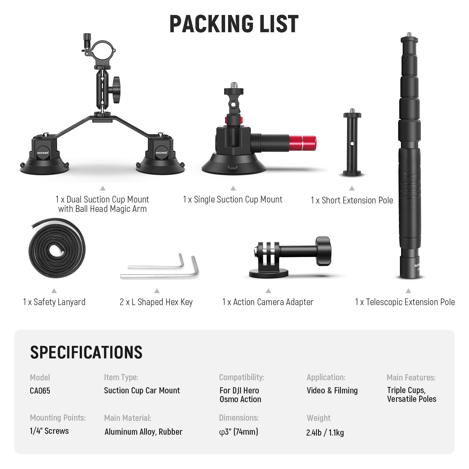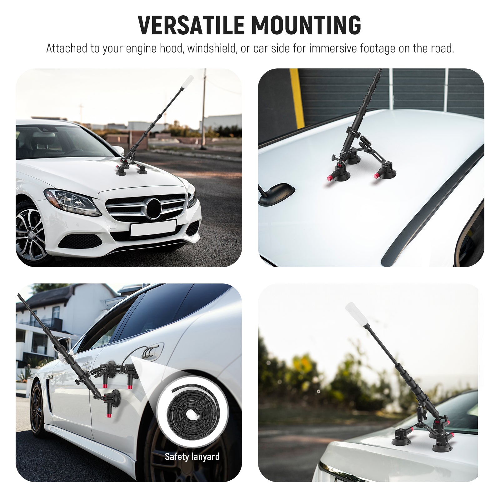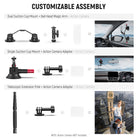 - Kit di supporto per auto a tripla ventosa : cattura filmati POV (punto di vista) immersivi da angolazioni di guida uniche come il cofano motore, il parabrezza interno/esterno, il cruscotto o la fiancata dell'auto. Il supporto per videocamera a ventosa fissa saldamente la tua action cam con tre potenti ventose e consente un posizionamento flessibile con aste di prolunga e un braccio magico con testa sferica per la registrazione video, con un cordino di sicurezza per una maggiore sicurezza. Nota: utilizzare a velocità inferiori a 80 km/h per evitare cadute accidentali.