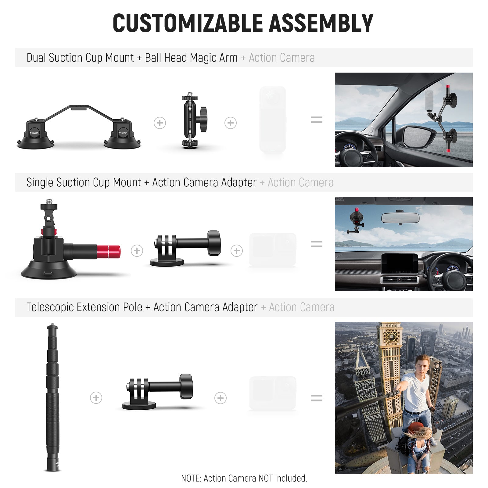 - Adattatore per action cam incluso : il supporto a ventosa singola, l'asta telescopica e l'asta di prolunga corta sono tutti dotati di una vite di montaggio da 1/4" per un montaggio versatile di fotocamere mirrorless per vlog, videocamere, supporti per telefoni, adattatori per action cam e altro ancora (solo l'adattatore per action cam è incluso). L'adattatore per action cam è compatibile con DJI OSMO Action 4 3 2 Hero 13 12 11 10 9, Insta360 X4 X3 X2, ecc.