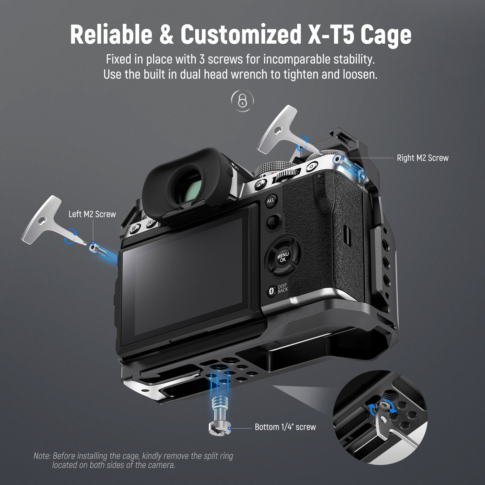 - Design antitorsione e antiscivolo : la tua fotocamera X-T5 sarà fissata con tre punti di vite: la vite inferiore da 1/4" e due viti M2 su entrambi i lati per un'incredibile stabilità. Un cacciavite riposto magneticamente sotto la gabbia può aiutare a fissare le viti I cuscinetti in gomma antiscivolo all'interno della gabbia proteggeranno la tua preziosa fotocamera dai graffi