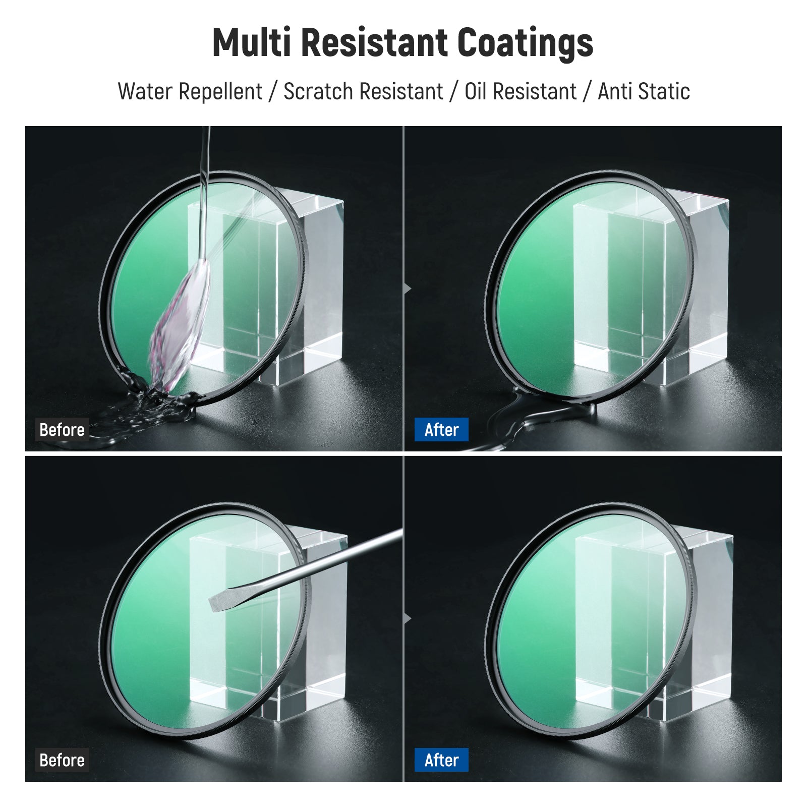 - Rivestimenti nano multipli : i rivestimenti nano multipli su entrambi i lati sono idrorepellenti, resistenti ai graffi e oleorepellenti, riducendo efficacemente la riflessione proveniente dal filtro stesso e dal terreno.