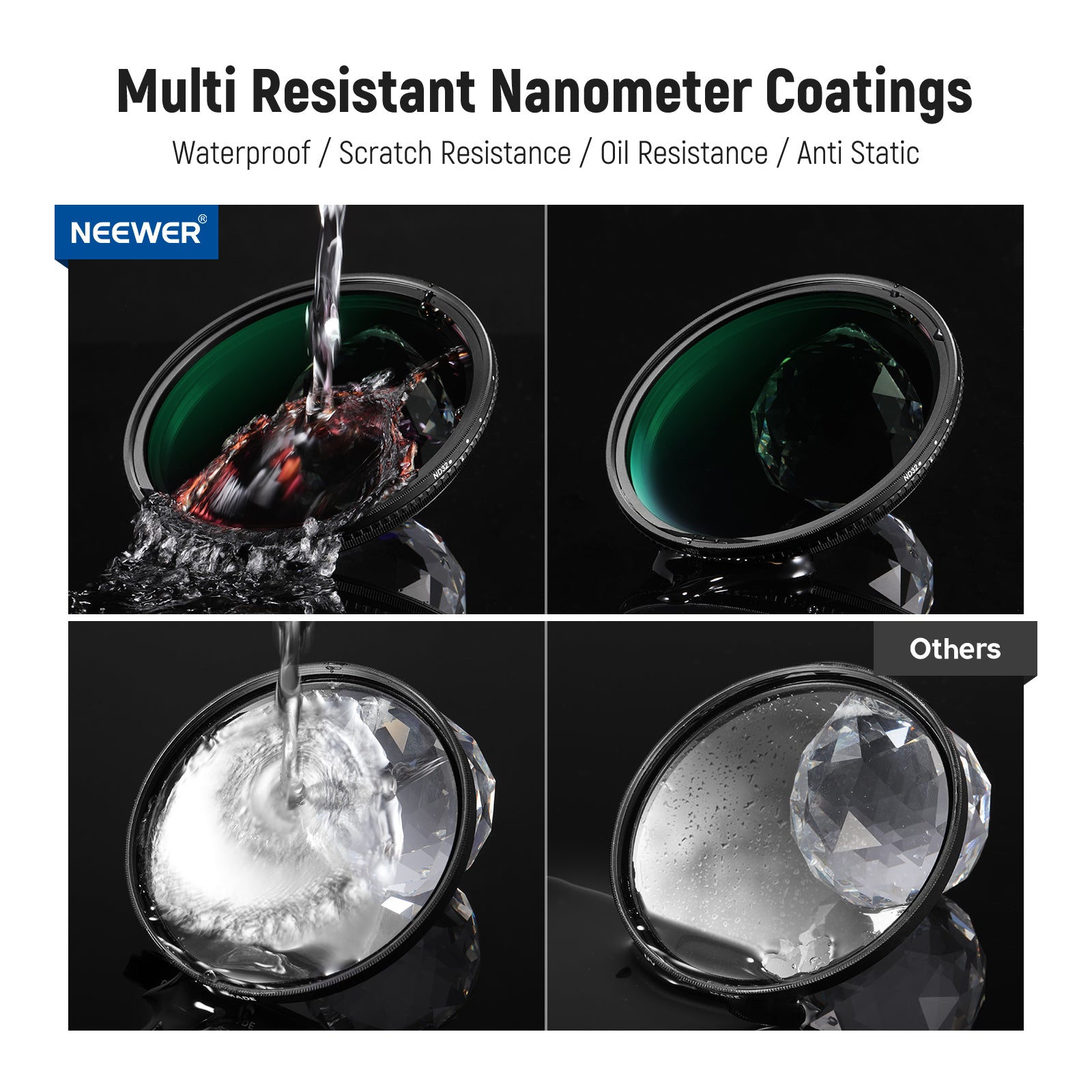 - Rivestimento nano multistrato : i 30 strati di nanorivestimenti su entrambi i lati rendono il filtro idrorepellente, resistente all'olio e ai graffi. Il filtro multistrato riduce inoltre efficacemente i bagliori e i riflessi e offre un aspetto fotografico naturale