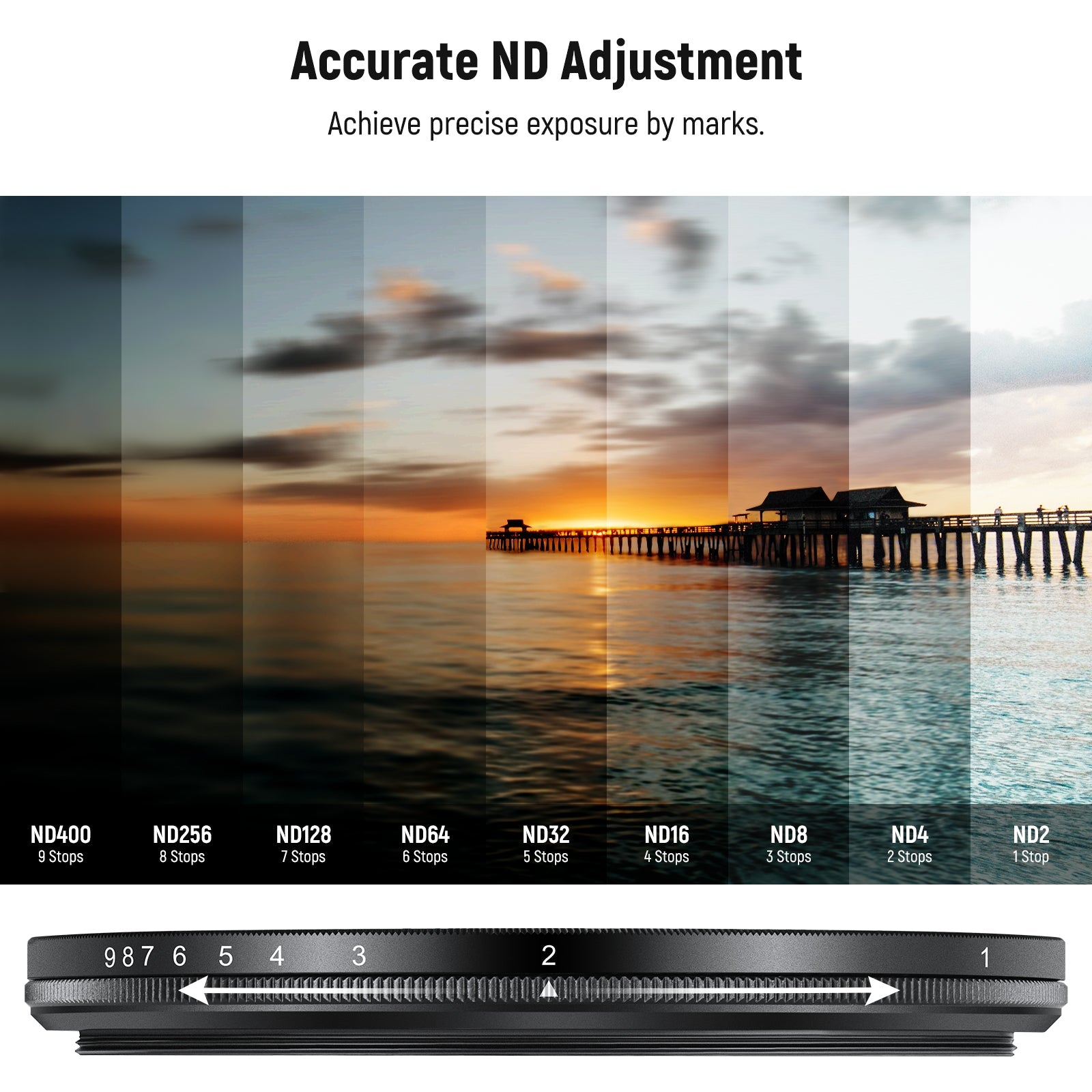 - Flexible Exposure Control- The variable ND2-400 filter offers limited 1-9 stops of light reduction. Rotate to precise stops for desired ND values and perfect exposure. Note: A dark X pattern may appear at maximum aperture. This is normal when the variable ND filter, with its two polarizing filters aligned at a specific angle, interacts with certain lenses and focal lengths. A protective cap with lanyard is included for the variable neutral density filter