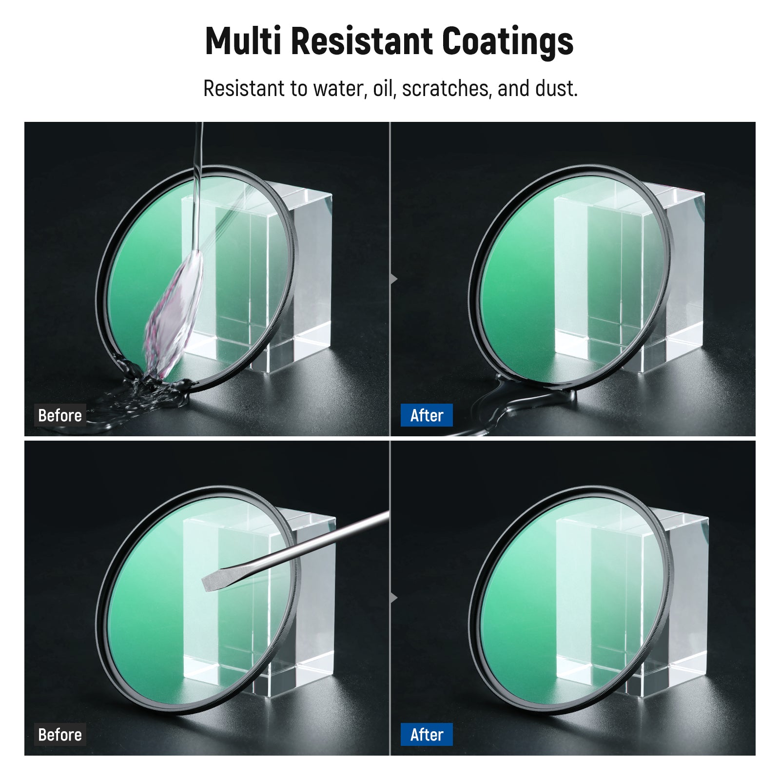 - Multiple Protective Coatings- Multiple protective coatings on both sides of the optical glass shield the filter from water, oil, dust, and scratches. A cleaning cloth is included for daily maintenance
