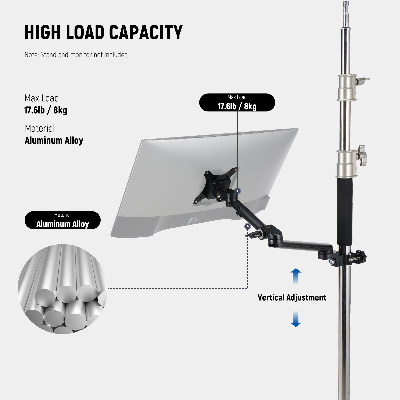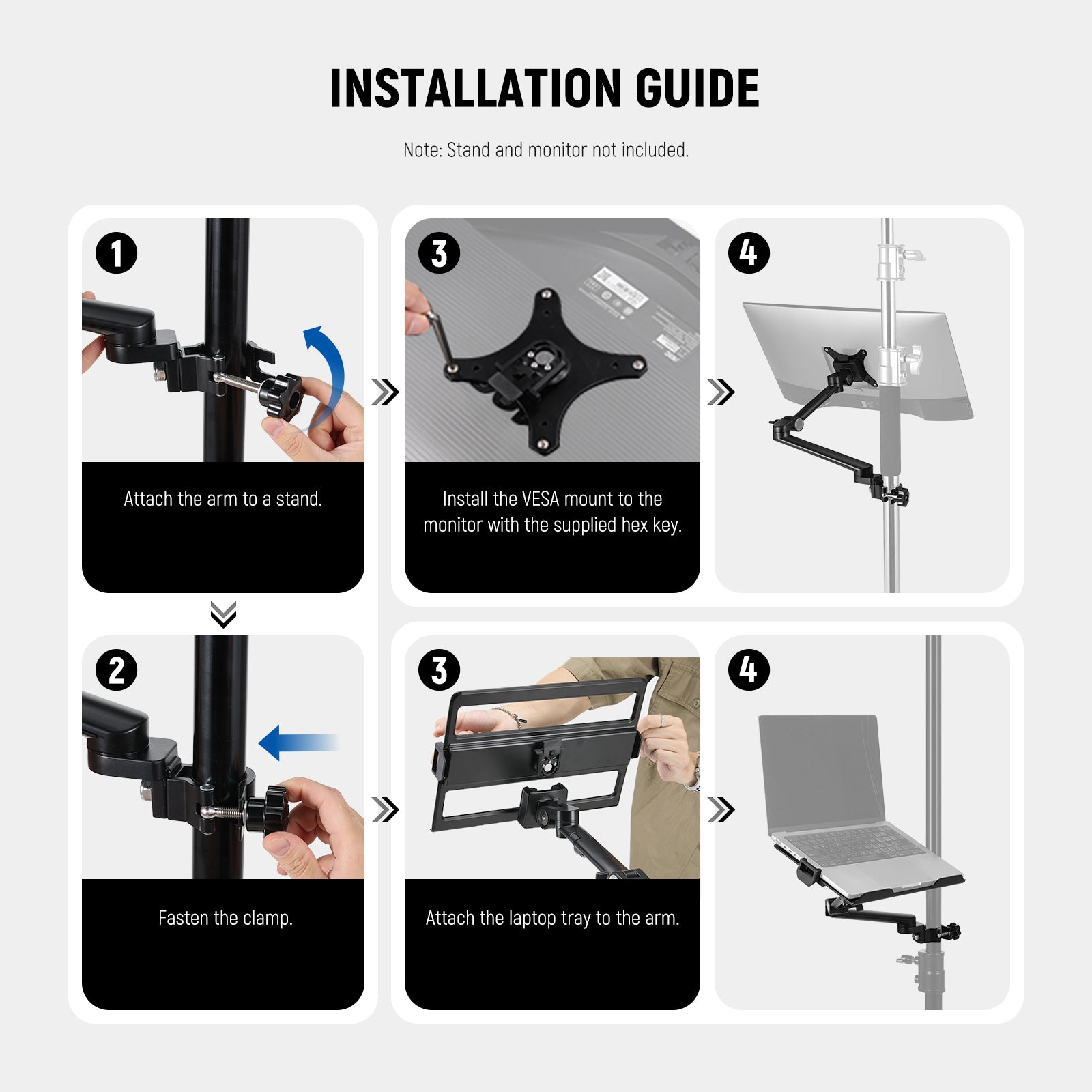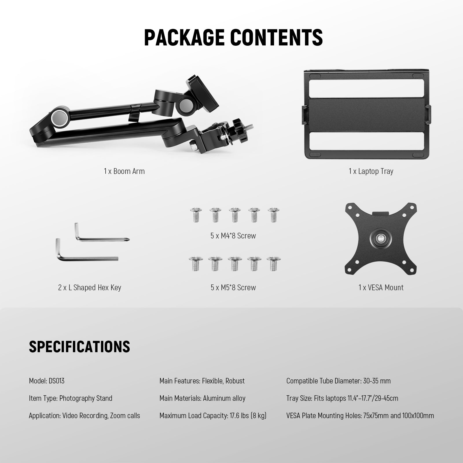 - Braccio singolo regolabile per laptop con morsetto - Questo DS013 è un robusto braccio singolo per montaggio su scrivania con una capacità di carico massima di 17,6 libbre (8 kg). Il braccio porta laptop è facilmente regolabile in altezza e angolazione, rendendolo ideale per la registrazione video, lo streaming o le conferenze online. La regolazione fluida assicura un posizionamento stabile mentre il braccio si blocca saldamente in posizione. Nota: è incluso solo il braccio del vassoio per laptop
