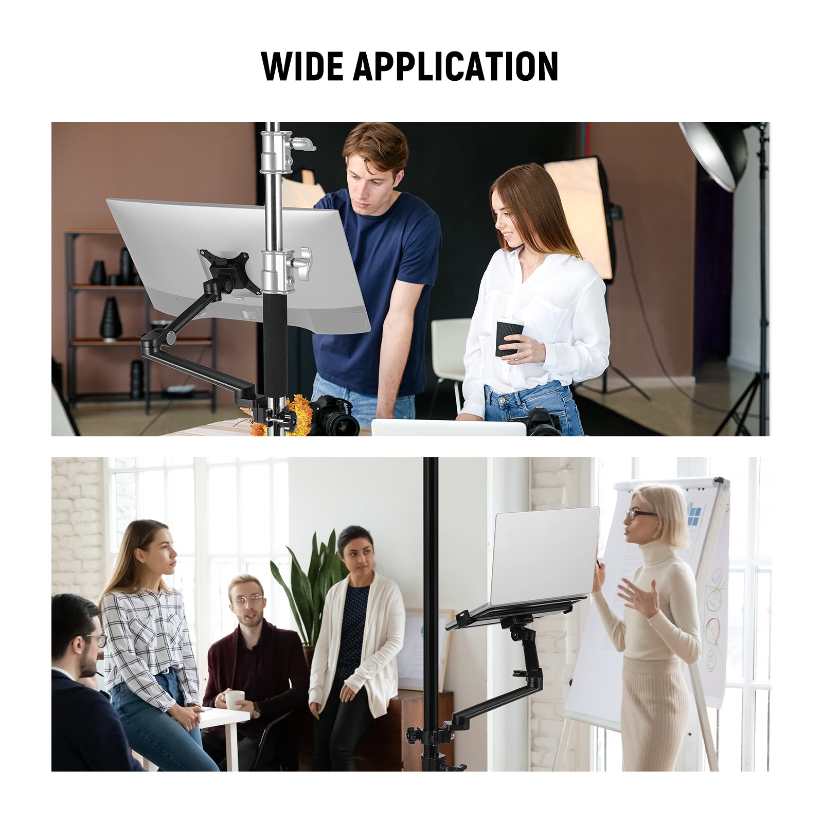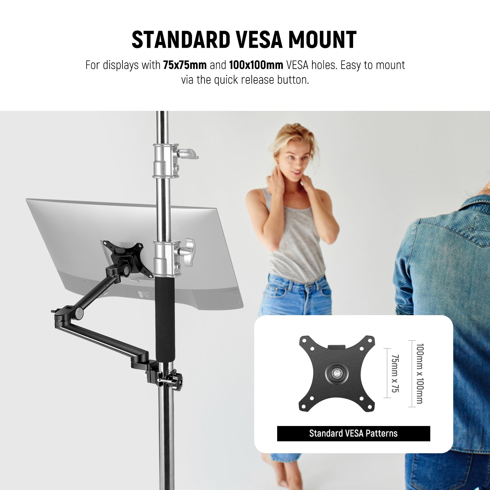 - Piastra VESA versatile : il kit braccio di montaggio per monitor da scrivania per laptop include una piastra di montaggio compatibile con VESA (modalità VESA standard). Supporta un'ampia gamma di monitor con fori di montaggio da 75x75 mm e 100x100 mm e viene fornito con un pulsante di sgancio rapido facile da usare per una facile installazione e rimozione