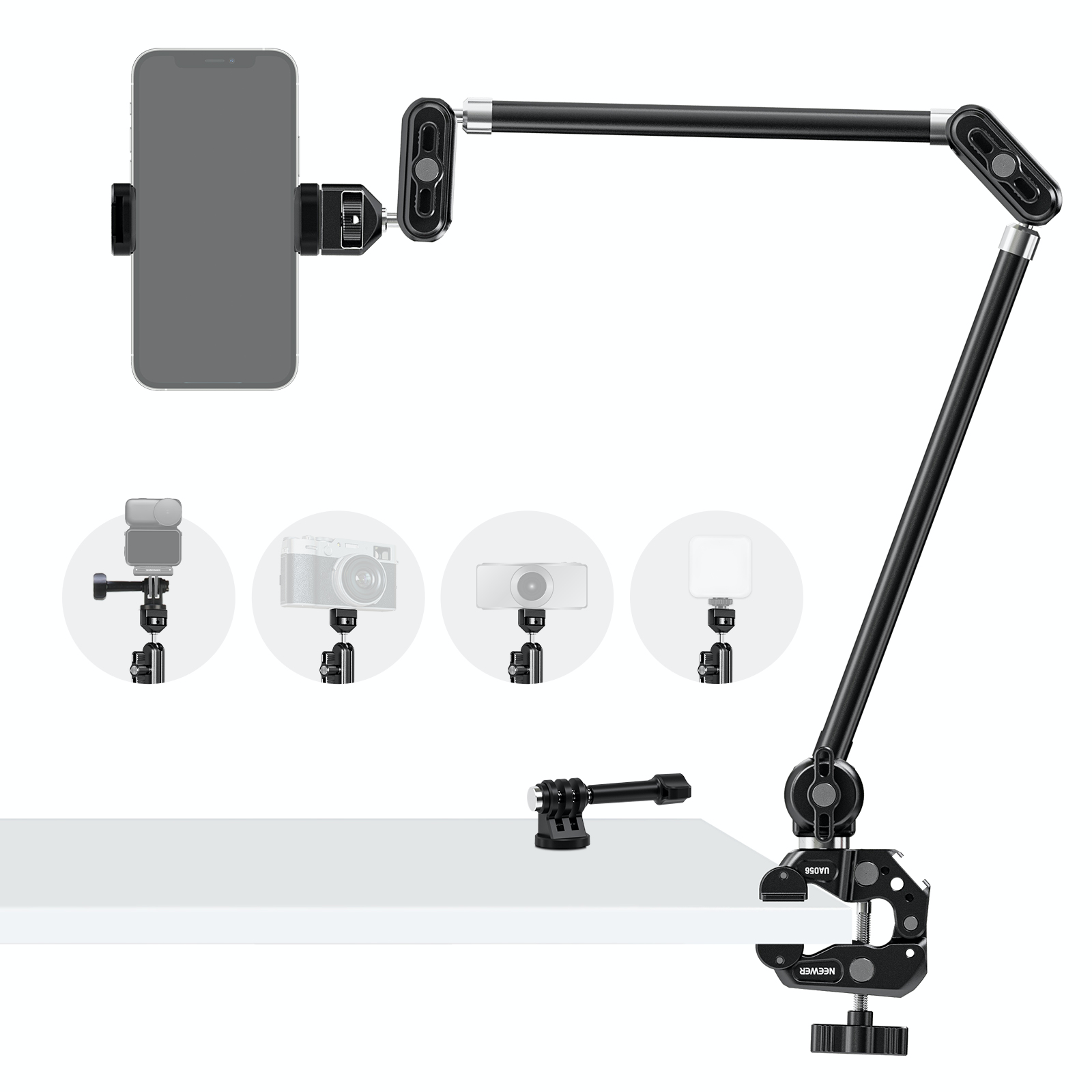- Stabilità e flessibilità migliorate : migliorato con il design di collegamento degli ingranaggi, il braccio magico articolato in metallo con supporto per telefono sostiene stabilmente una fotocamera, una webcam o un telefono (carico massimo 2,2 libbre/1 kg) sopra la testa, con un morsetto a C super e tre punti di snodo per un montaggio sicuro e la massima stabilità. La struttura a testa sferica multipla consente un posizionamento flessibile e il design integrato non richiede assemblaggio, pronto all'uso come elemento essenziale per la creazione di contenuti e indispensabile per gli influencer.