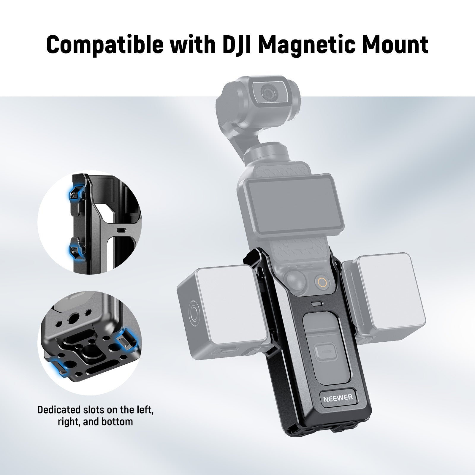 - Compatible with DJI Magnetic Mount- Dedicated slots on the left, right, and bottom sides are compatible with DJI Action 2 Magnetic Adapter Mount and NEEWER M20 Fill Light