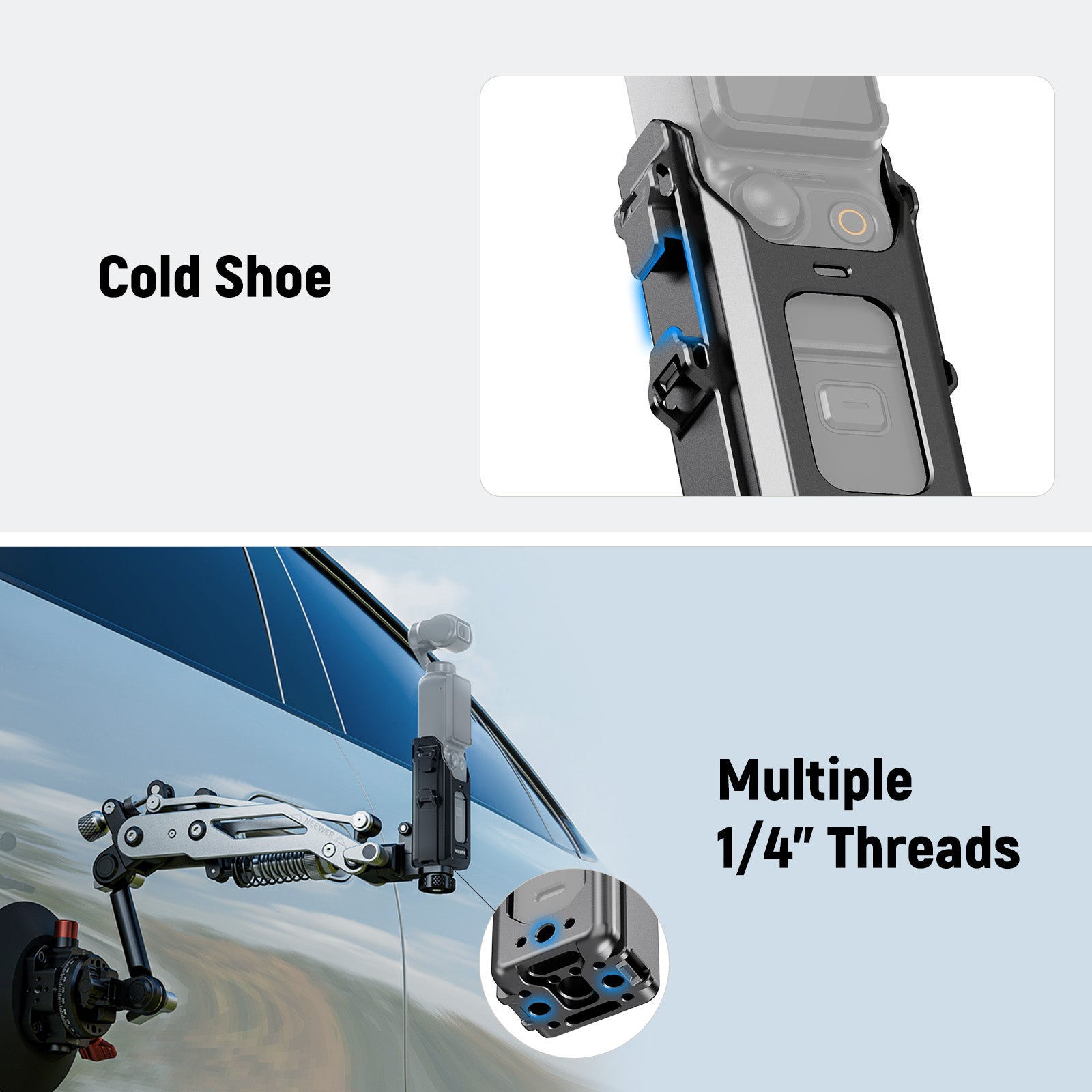 - Cold Shoe & Multiple 1/4" Threads- Mount an LED video light (RGB62/PL81), mini microphone (VM10), and other small accessories via the cold shoe for improved shooting. Several 1/4" threads attach the cage to a tripod, camera stand, or magic arm for stable support and function expansion