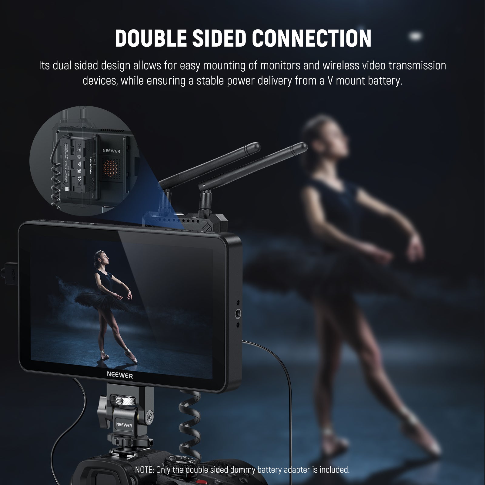 - Dual Sided Dummy Battery- With a CNC aluminum alloy frame, the dual sided dummy battery securely holds two devices at once - such as a monitor (compatible with Atomos Ninja/Shinobi), a wireless transmitter (compatible with DJI SDR), or an LED light, and power two devices simultaneously using the built in D TAP power adapter and cable, as well as the Type C and NP-F battery outputs. The design simplifies setups and makes your equipment more compact and efficient