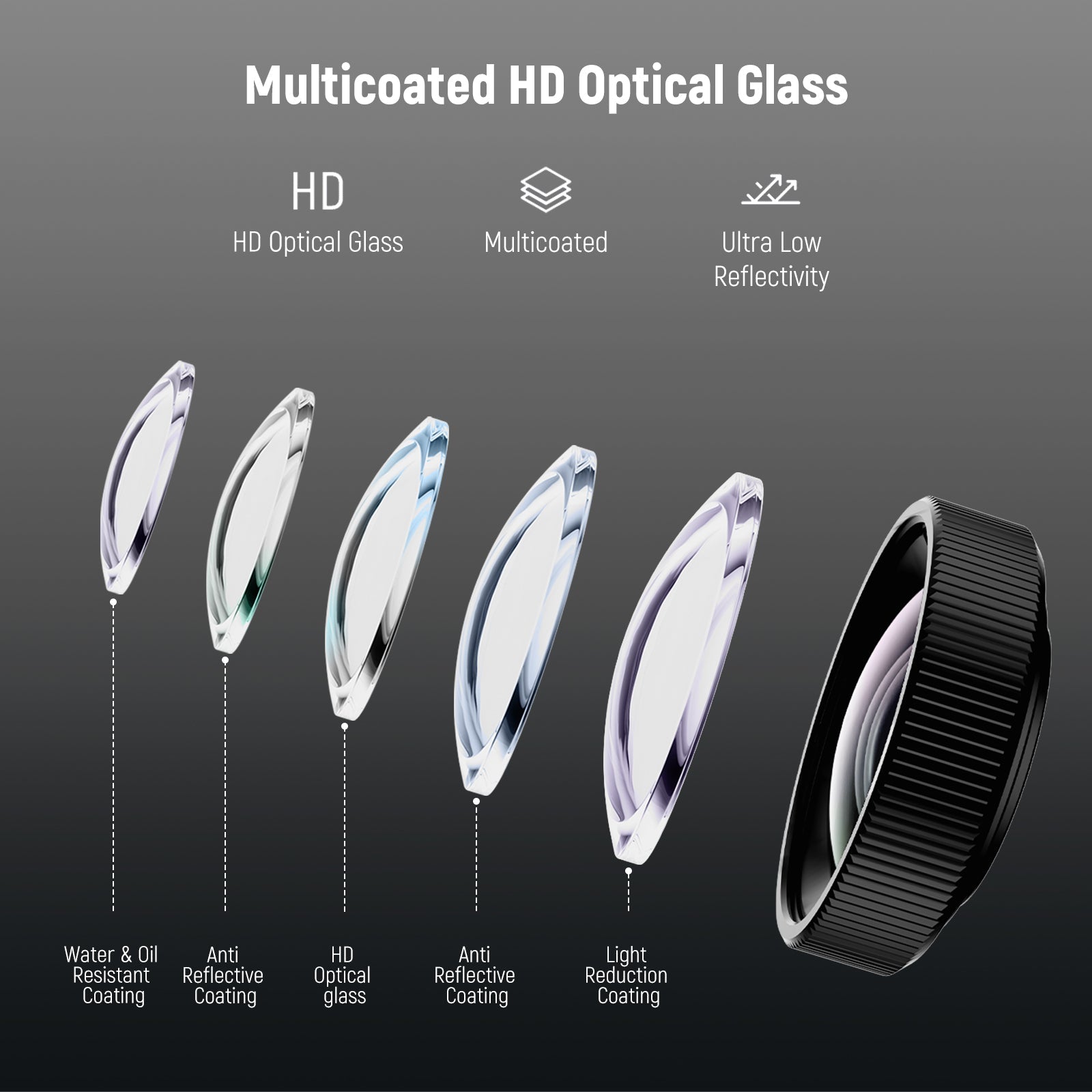 - Vetro ottico HD multistrato : il vetro ottico HD con 2 elementi in 1 gruppo garantisce un'elevata nitidezza. I molteplici rivestimenti protettivi a bassa riflettanza riducono efficacemente i riflessi e le immagini fantasma, resistendo al contempo a macchie e impronte digitali.