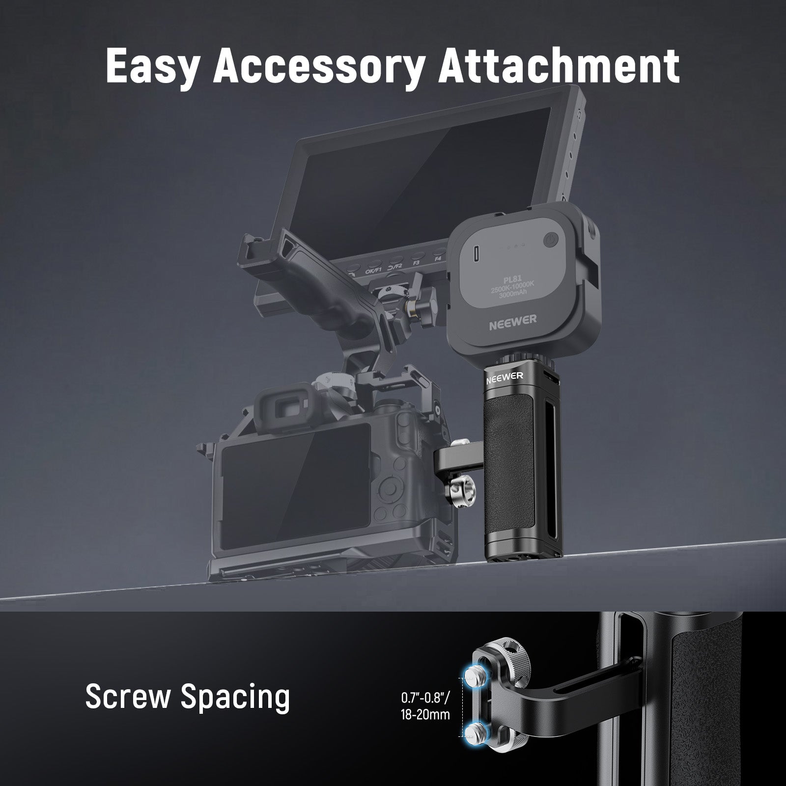 - Maniglia laterale universale leggera - Questa maniglia laterale compatta e leggera si collega alla gabbia della fotocamera o all'impianto video tramite due viti a testa zigrinata da 1/4". Con spaziatura delle viti regolabile da 0,7" a 0,8" (18-20 mm), è compatibile con le gabbie SmallRig e NEEWER gabbie per fotocamera (CA020 CA019 CA014 CA011 CA002) e ti aiuta a stabilizzare una fotocamera DSLR o mirrorless fino a 33 libbre/15 kg (non compatibile con Tilta)