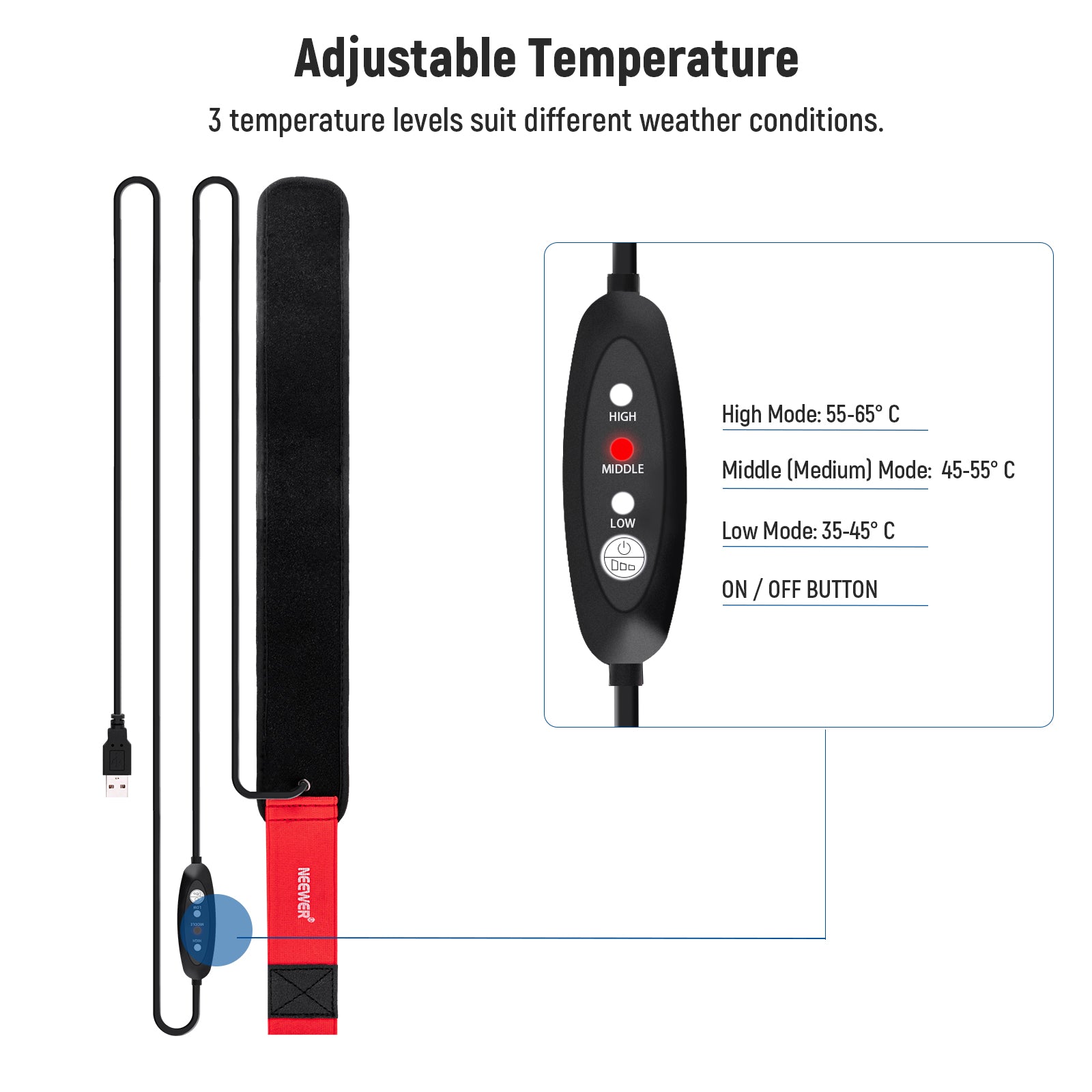 - 3 livelli di temperatura : un regolatore di temperatura offre 3 impostazioni (modalità alta: 55-65°C; modalità media: 45-55°C; modalità bassa: 35-45°C) per adattarsi a diversi ambienti meteorologici