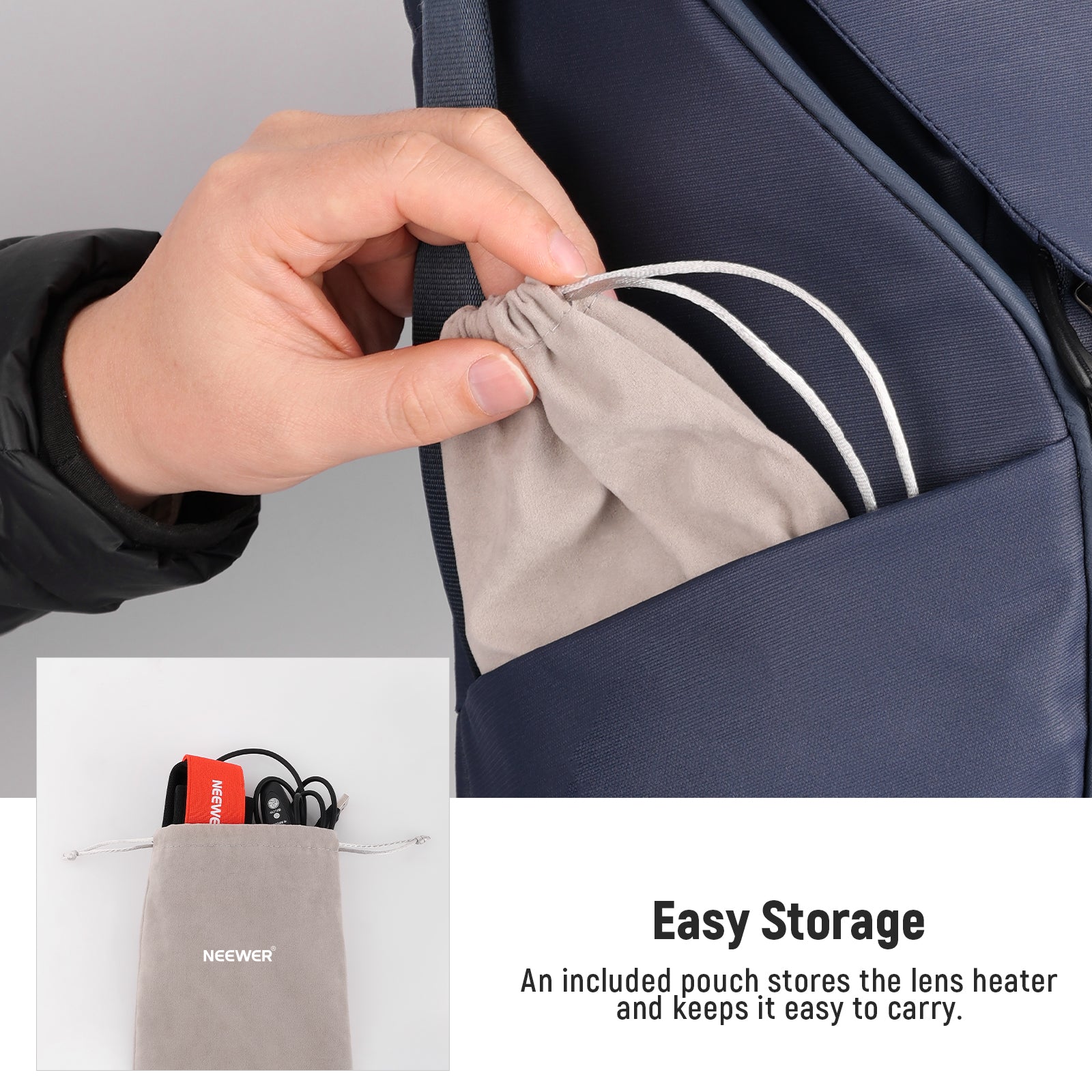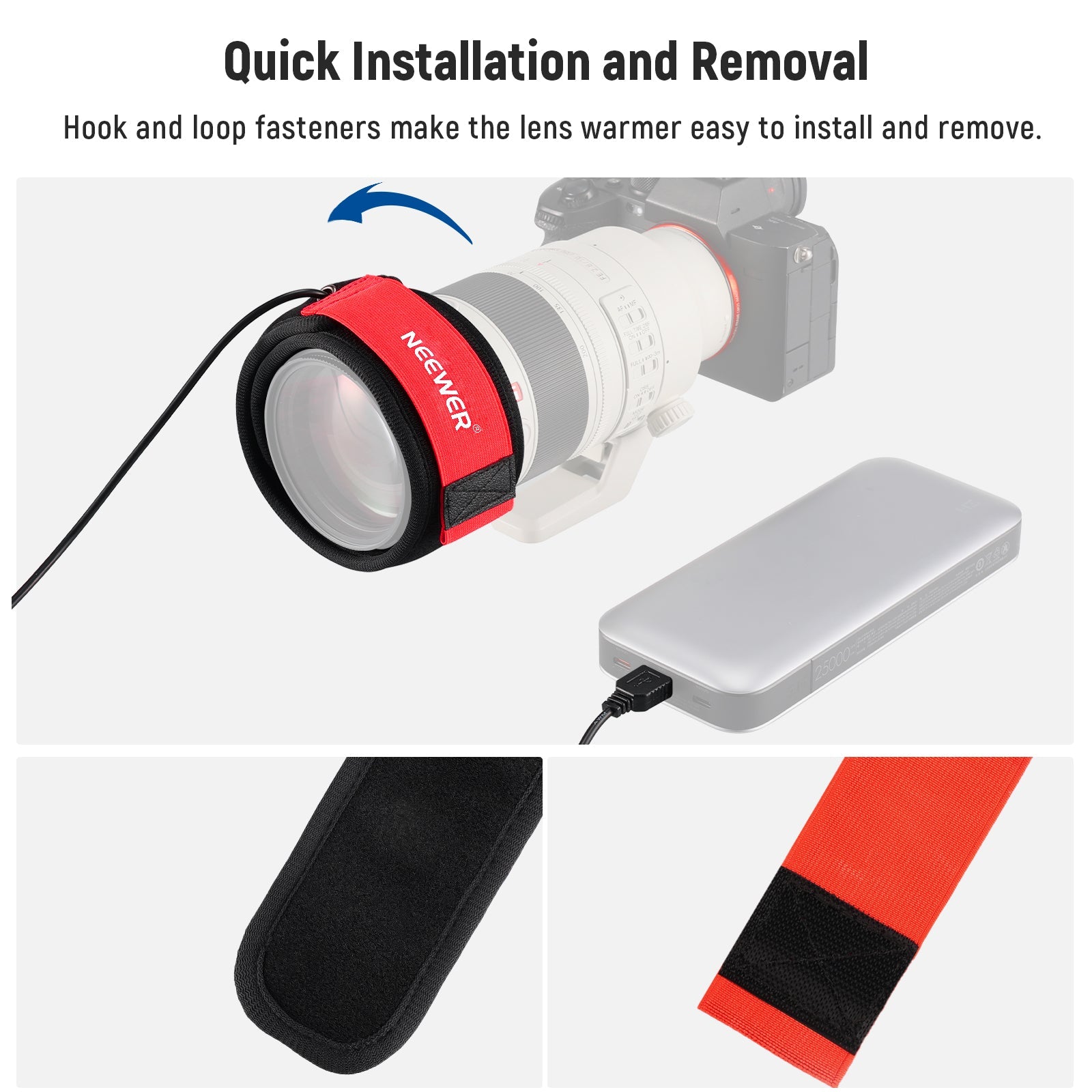 - Design con chiusura a tocco : grazie alle pratiche chiusure a tocco, il riscaldatore può avvolgere l'obiettivo o il telescopio in modo sicuro ed è facile da regolare