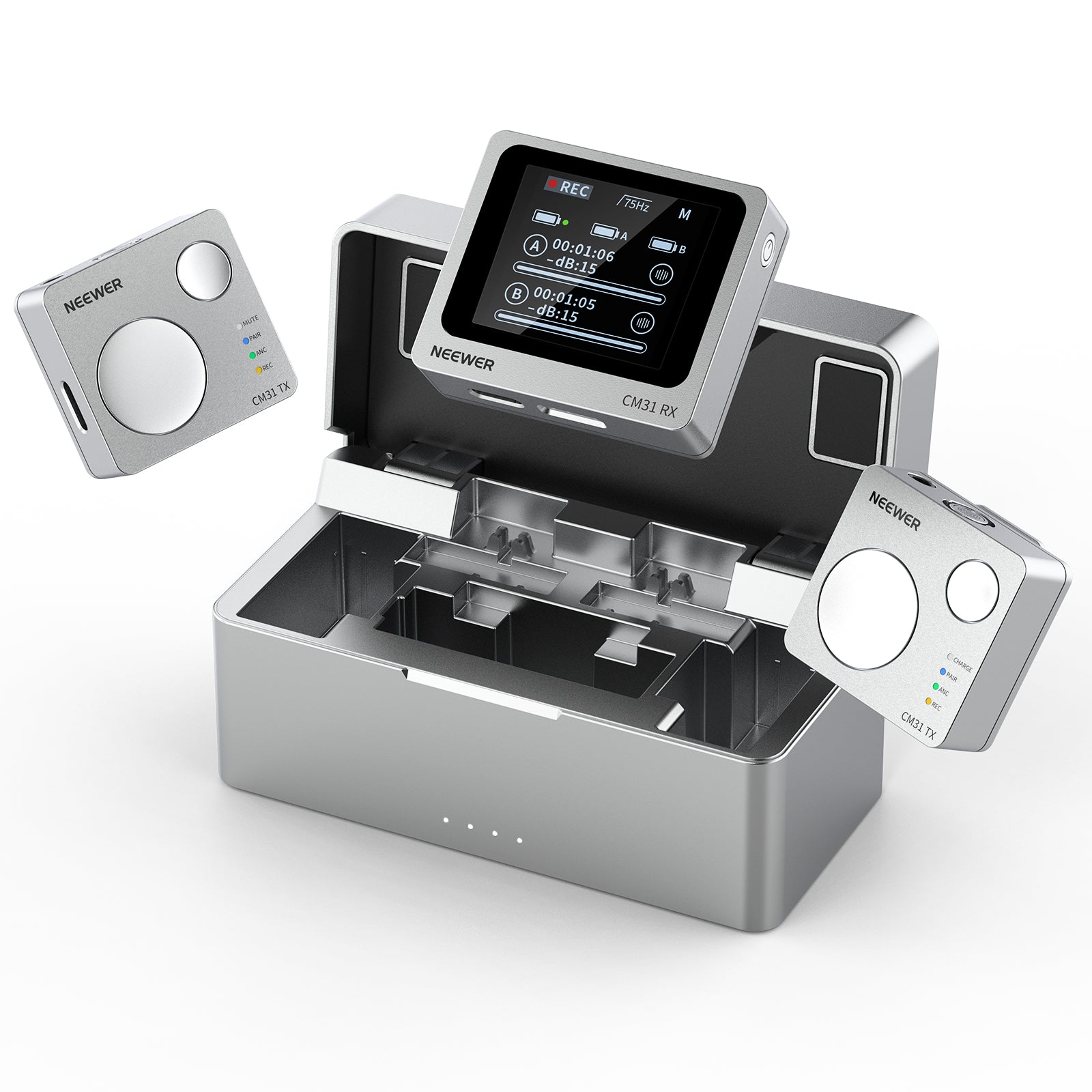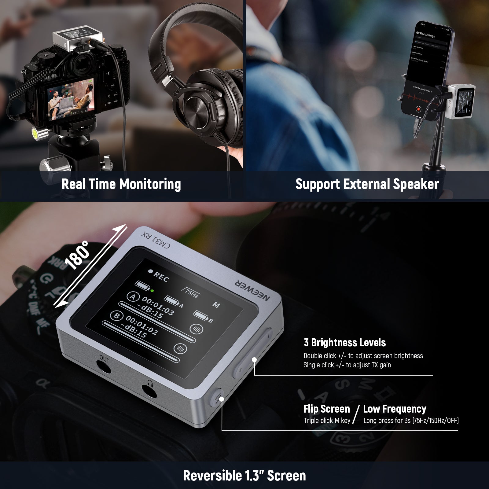 - Schermo LCD reversibile di facile utilizzo : l'RX è dotato di uno schermo LCD da 1,3" che consente di passare dall'interfaccia singola a quella doppia. Premere il pulsante "M" tre volte per ruotare lo schermo di 180° e renderlo più intuitivo per i videografi. Premere due volte il pulsante del volume per regolare la luminosità dello schermo. Quattro spie luminose sul TX forniscono informazioni sullo stato corrente del dispositivo.